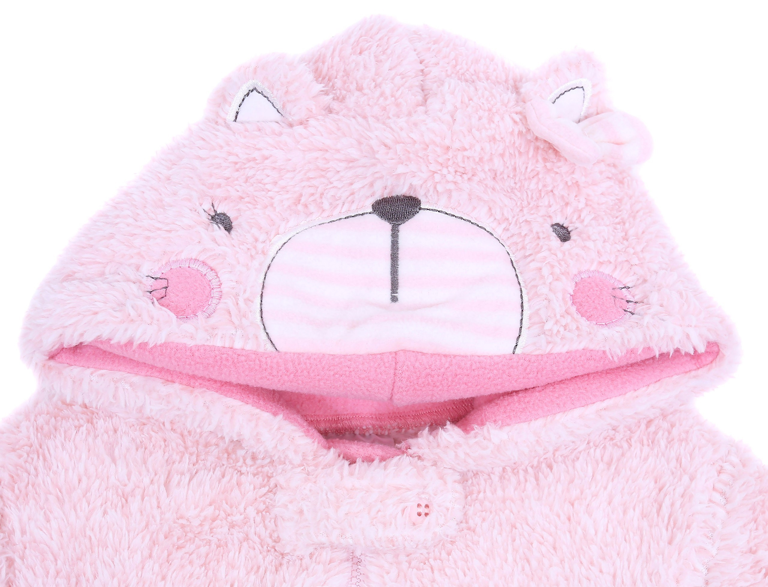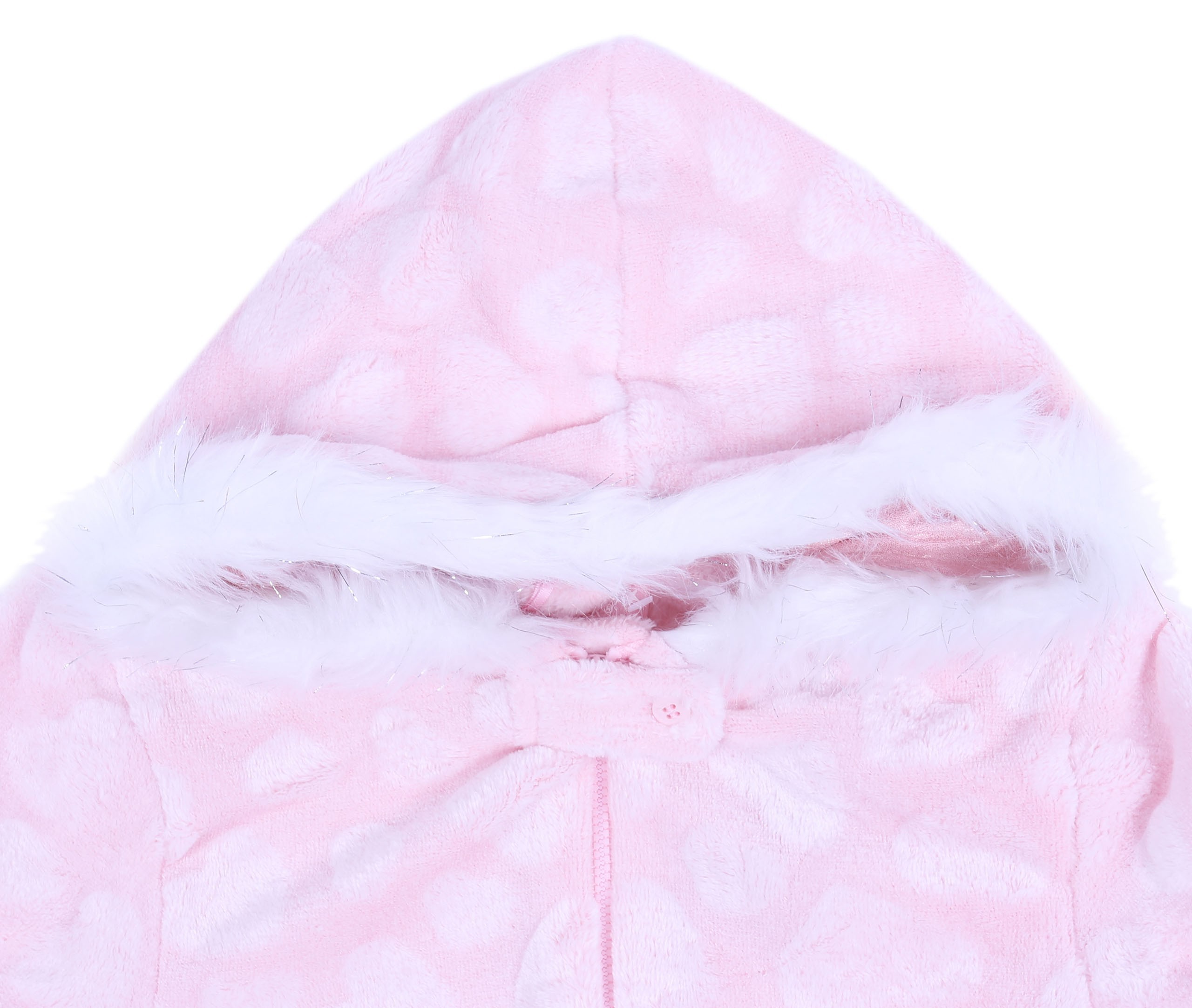 Różowa piżama jednoczęściowa, w wytłaczane serca, z kapturem.