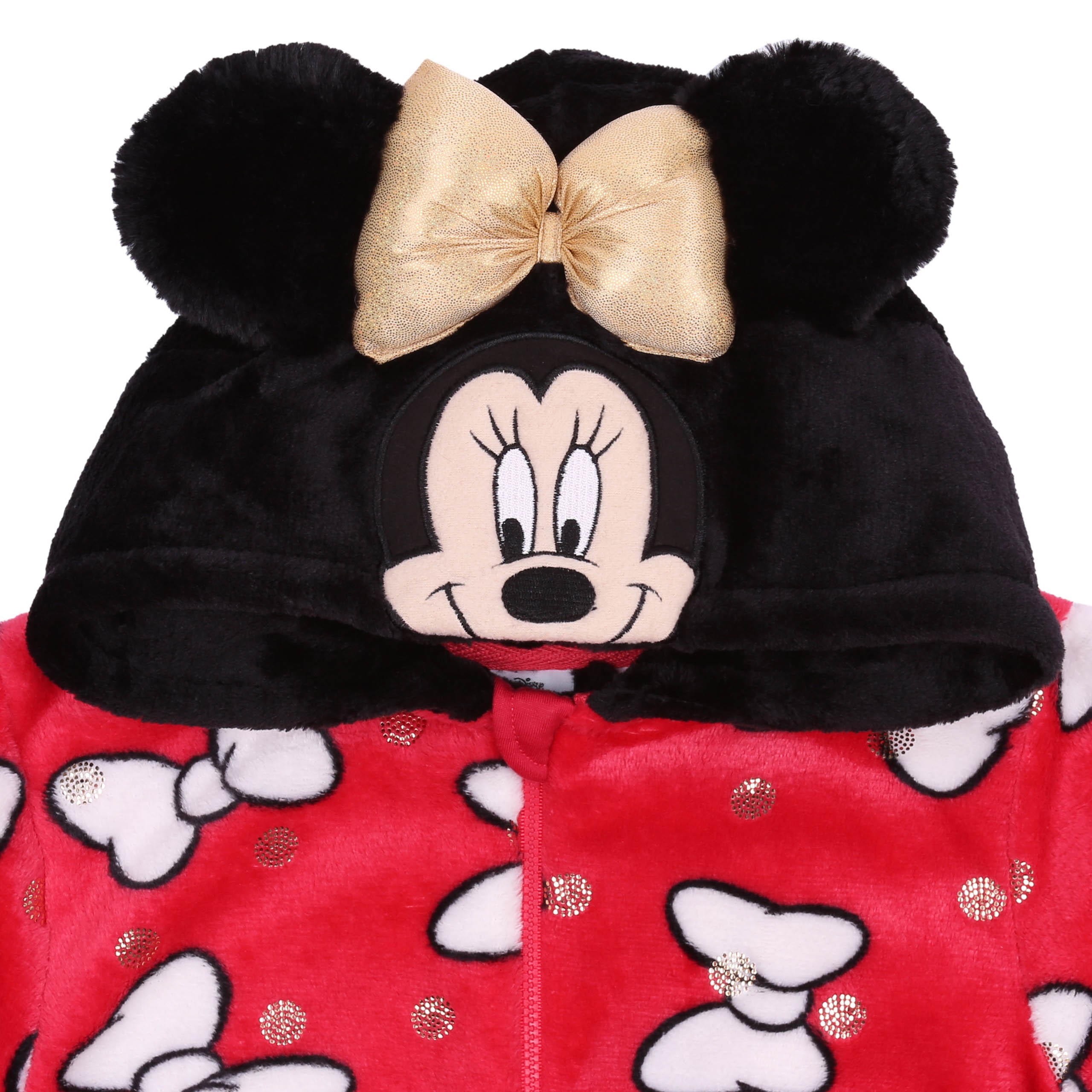 Czerwona, jednoczęściowa piżama z kapturem przedstawiającym Myszkę Minnie.