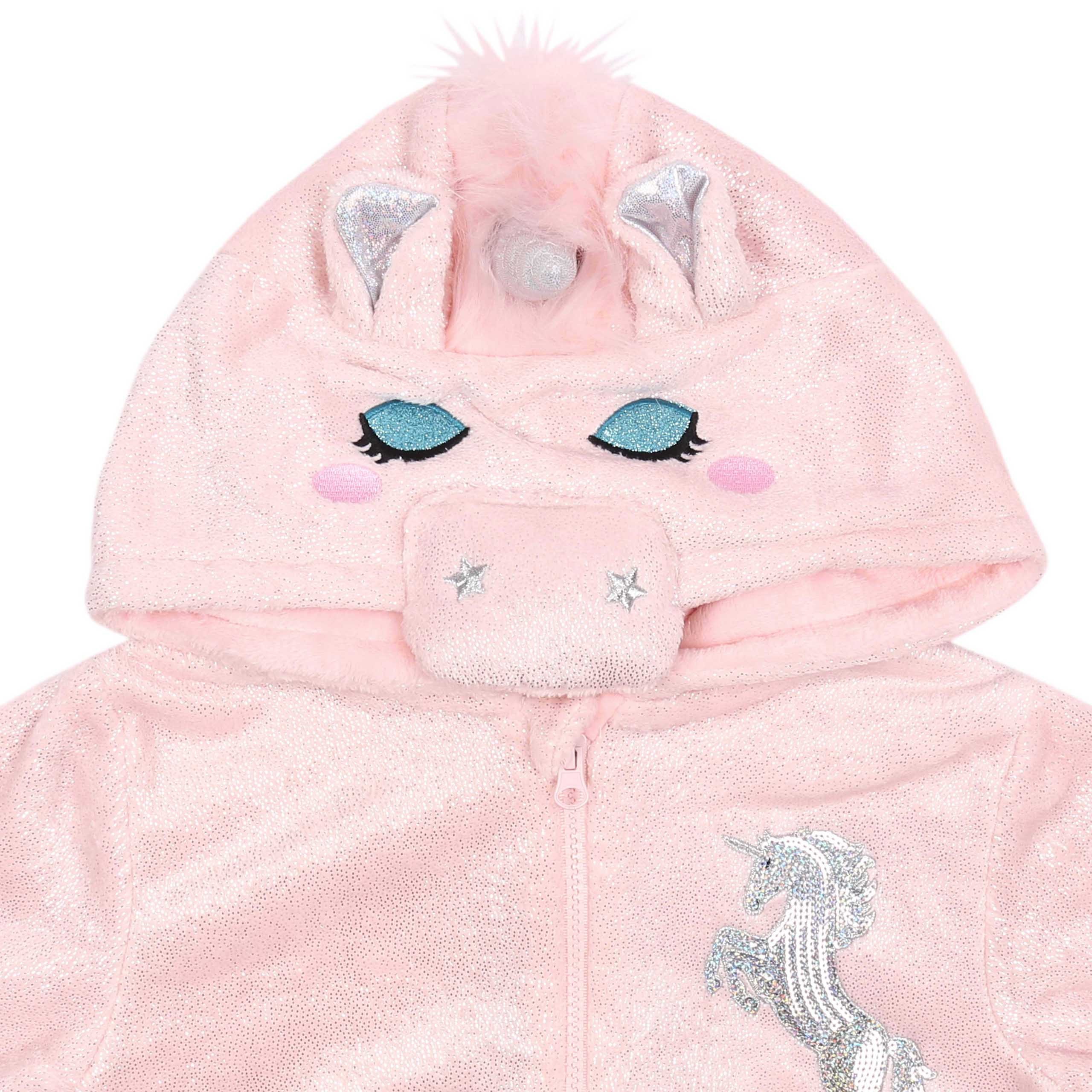 Różowa, połyskująca piżama jednoczęściowa dla dzieci, z kapturem przedstawiającym jednorożca.