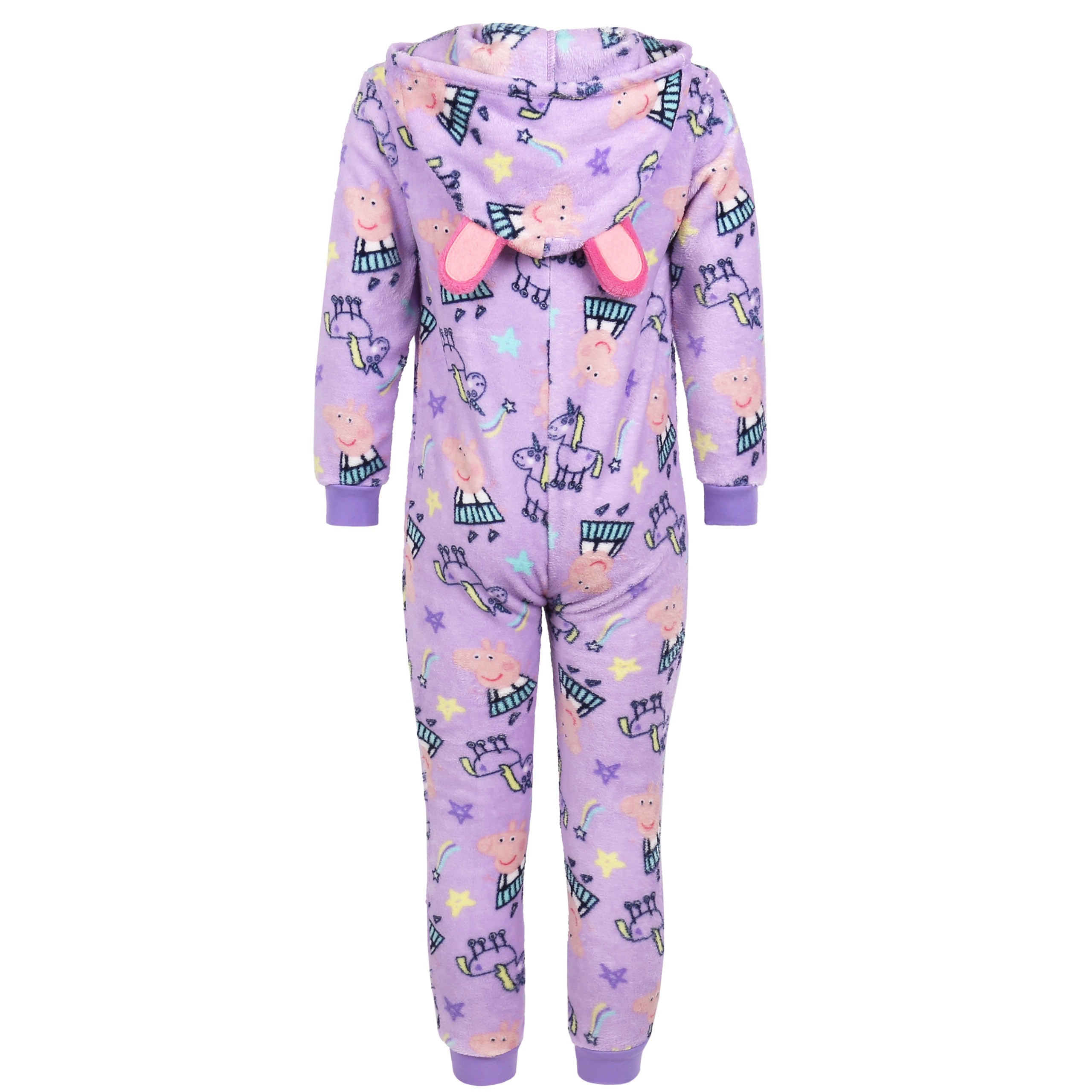 Fioletowa piżama jednoczęściowa dziecięca z motywem uroczej Świnki Peppy, z kapturem.
