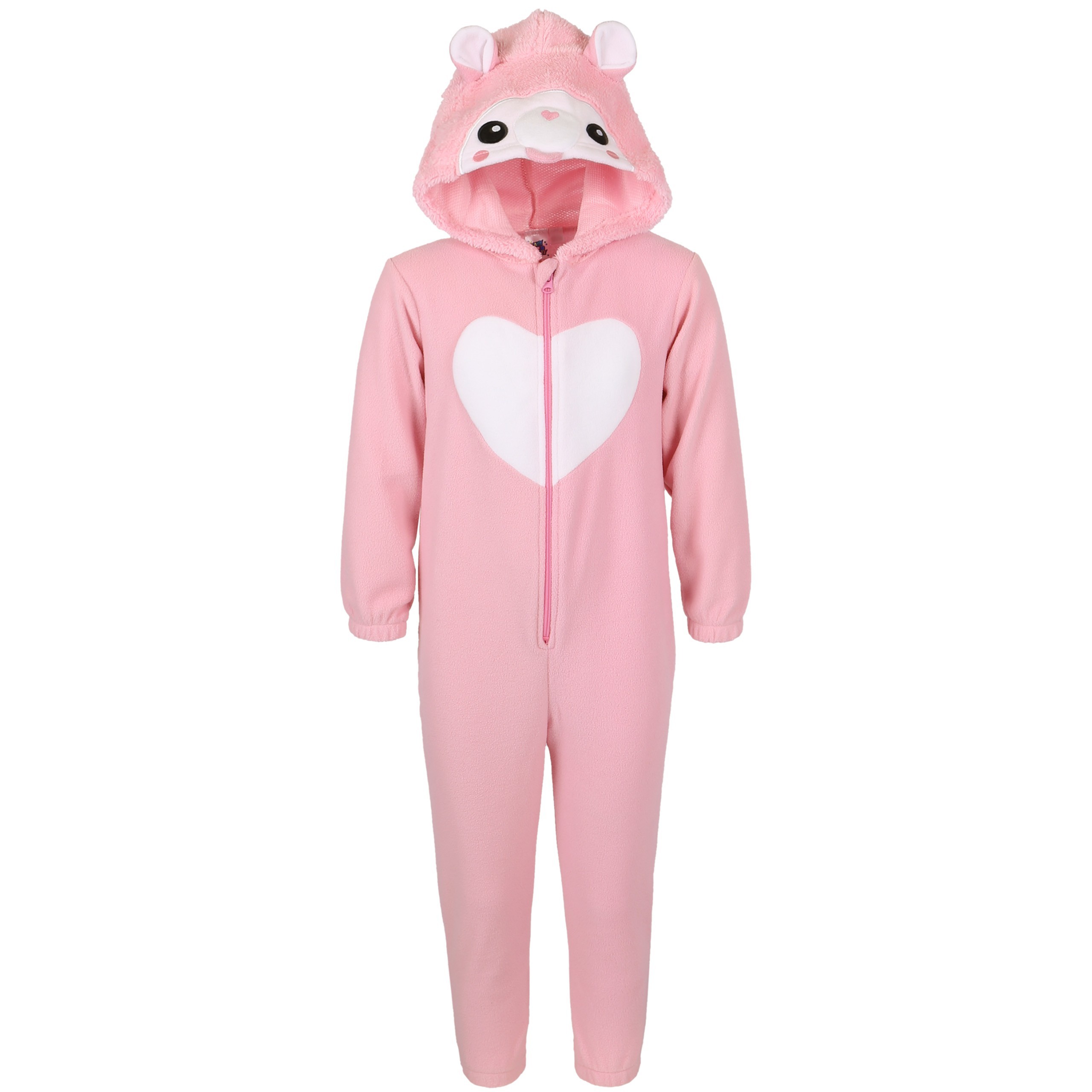 Różowa piżama jednoczęściowa dziecięca z motywem lamy, z kapturem.