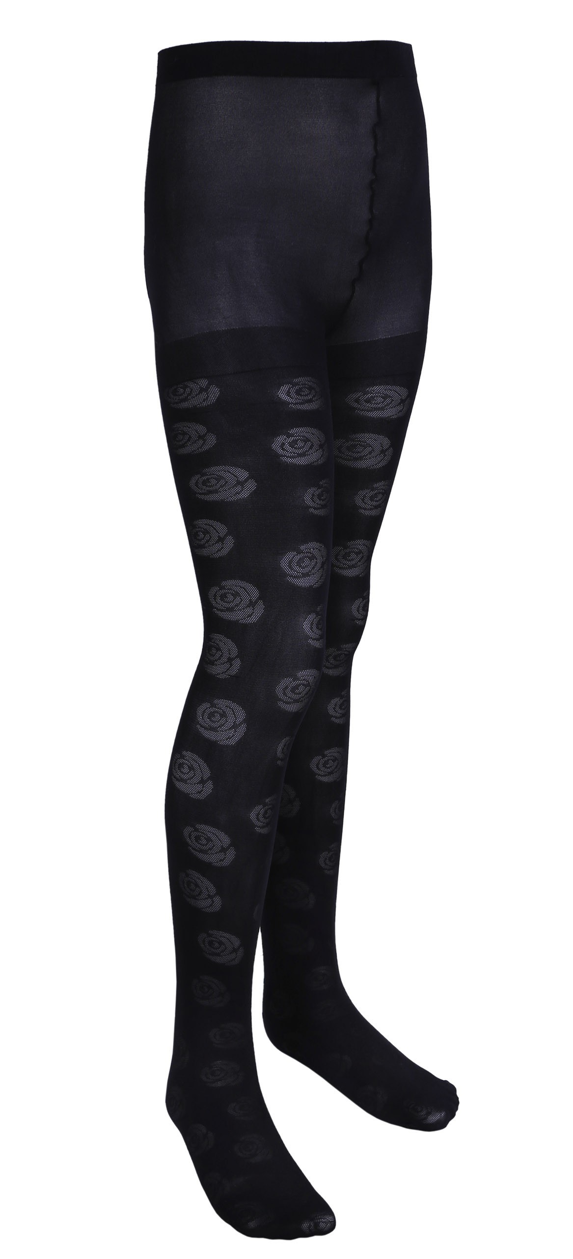 Komplet dwóch par czarnych, dziewczęcych rajstop w powtarzający się wzór róż.