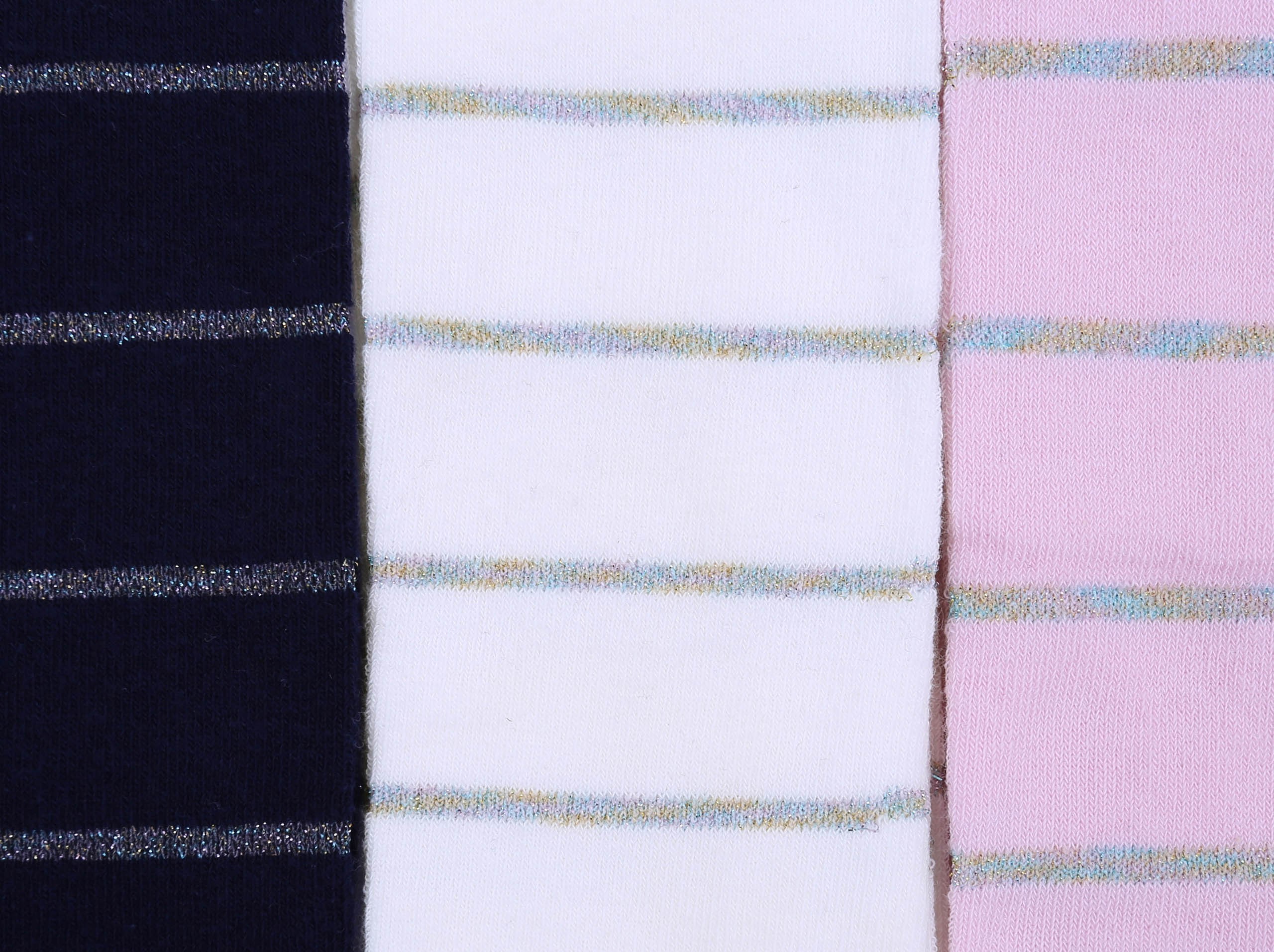 Zestaw trzech par rajstop w kolorach granatowym, różowym i kremowym.
