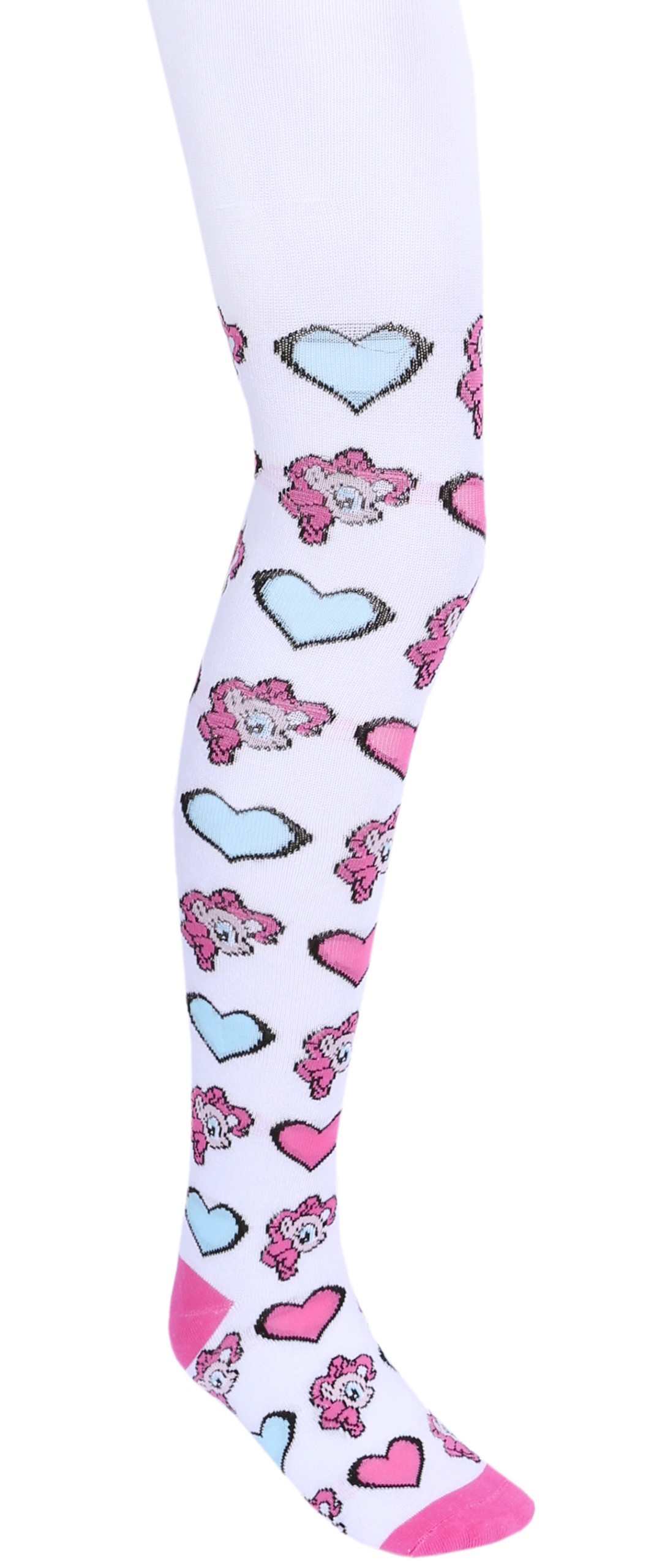 Jedna para, białych, dziewczęcych rajstop w powtarzający się wizerunek kucyka Pinkie Pie,