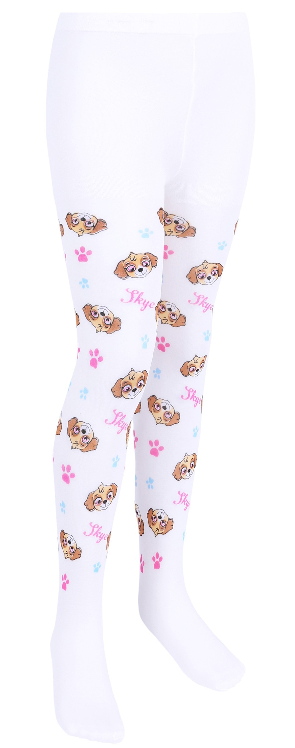 Jedna para, białych, dziewczęcych rajstop w powtarzający się wizerunek Skye, postaci z serialu animowanego "Psi Patrol".