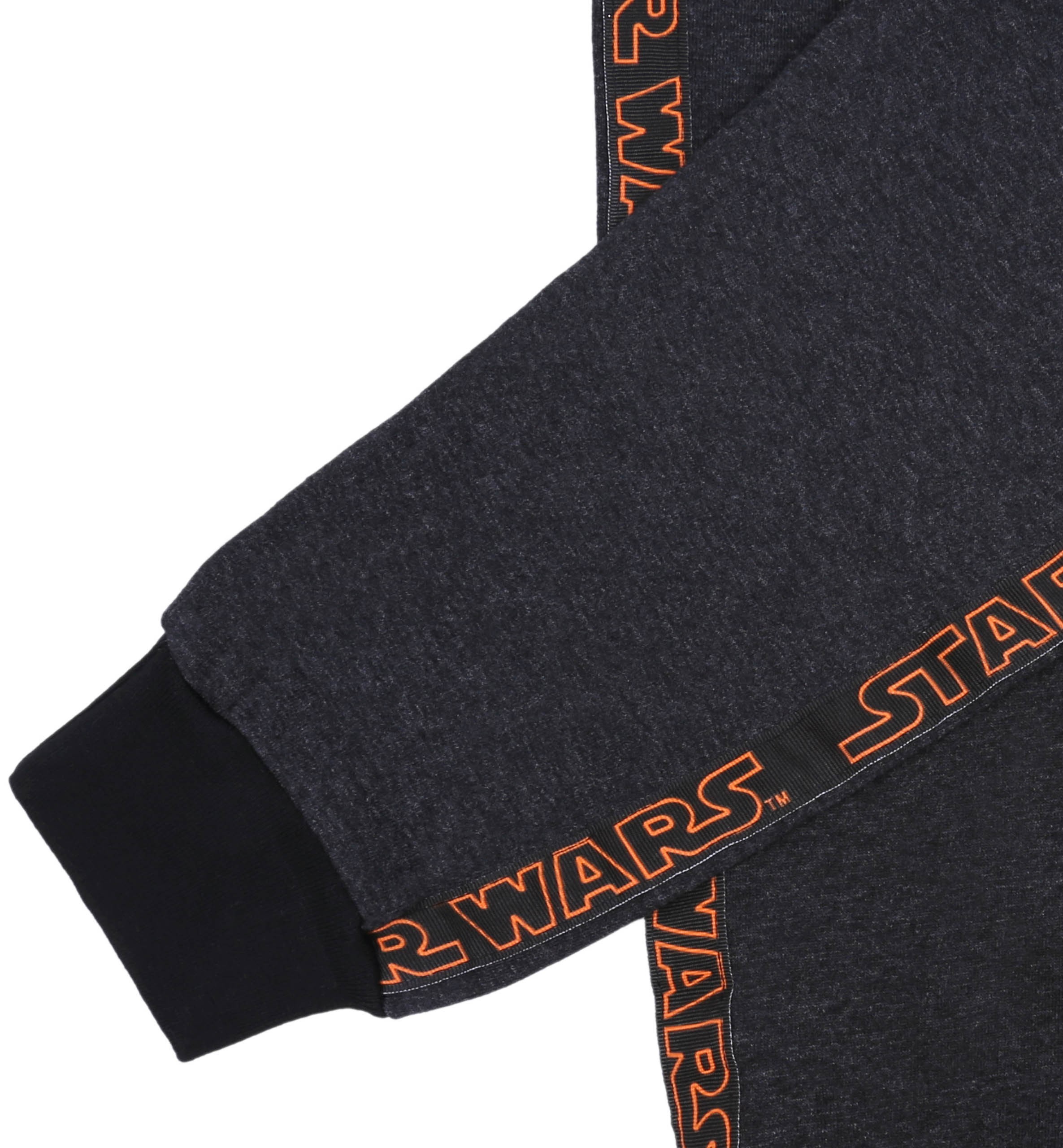 Ciemnoszare spodnie dresowe z czarnymi lampasami po bokach w powtarzający się napis STAR WARS.