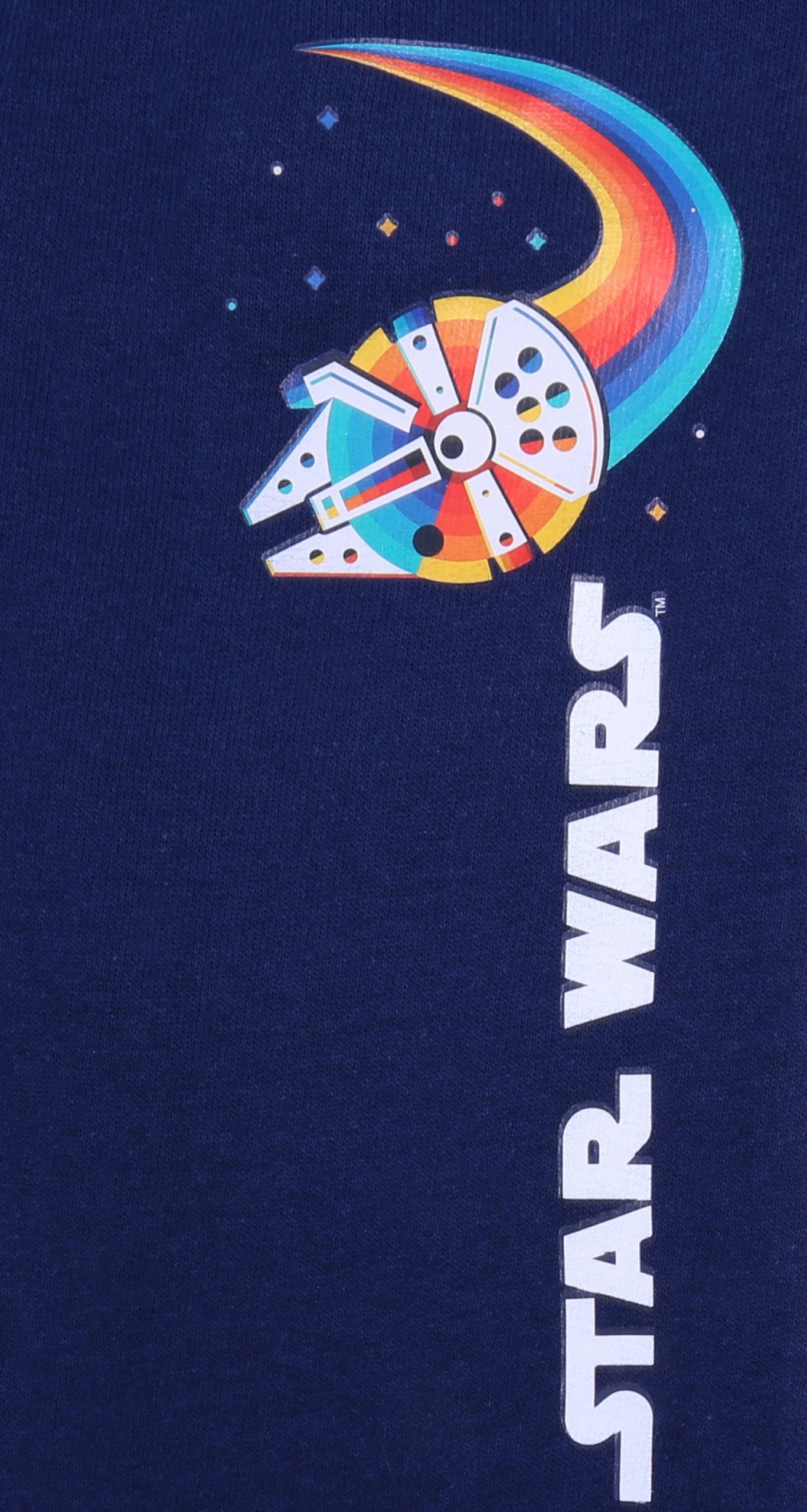 Granatowe spodnie dresowe z przodu z nadrukiem napisu STAR WARS.