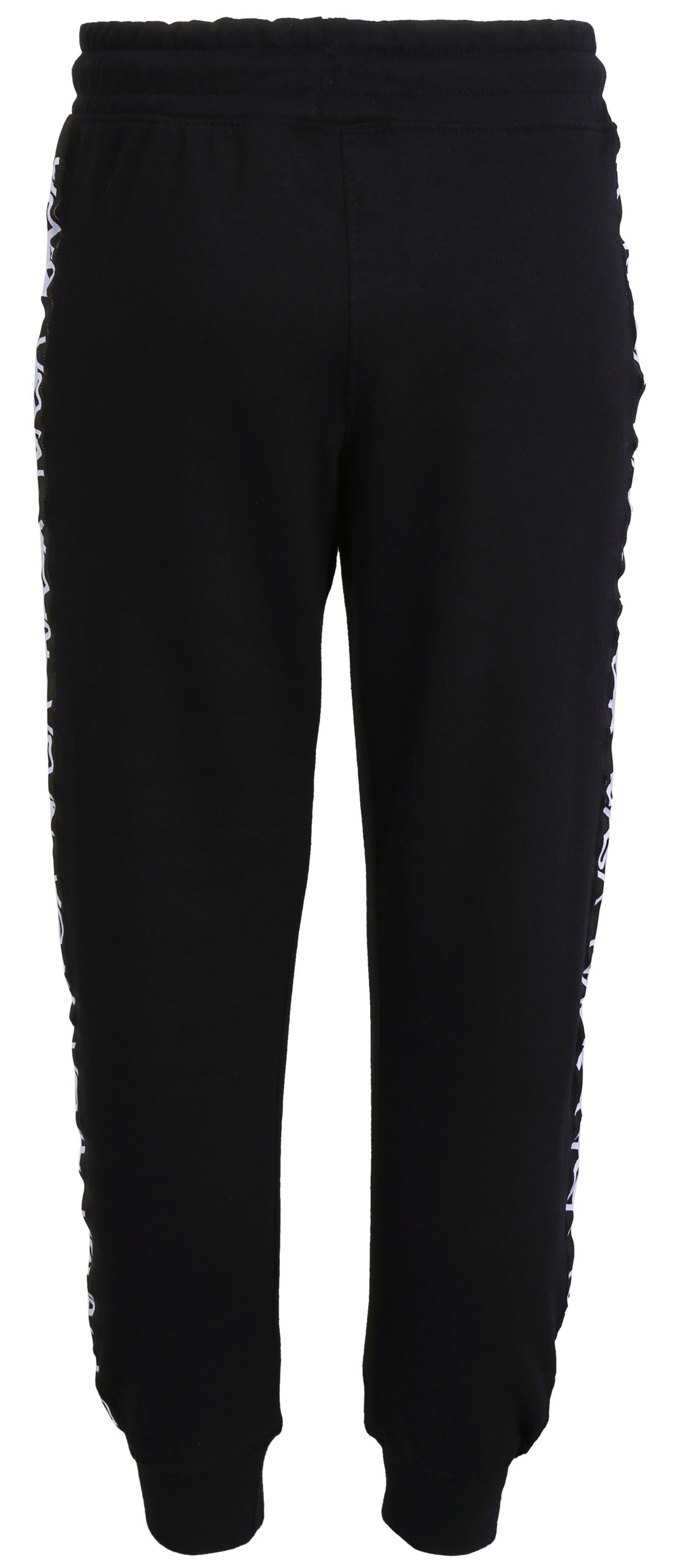 Czarne spodnie dresowe z lampasami po bokach, w powtarzający się napis "NASA".