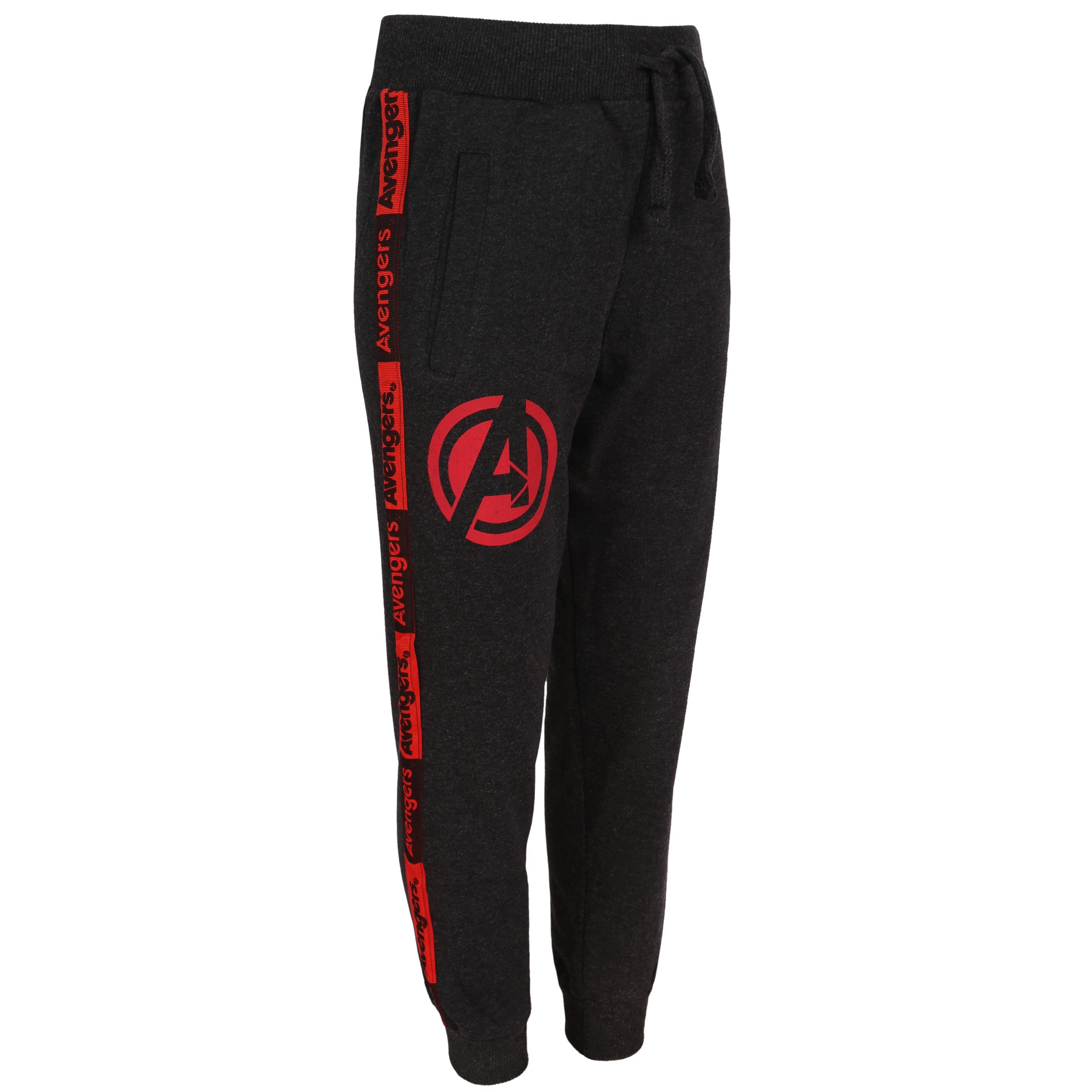Ciemnoszare spodnie dresowe z przodu z nadrukiem symbolu grupy superbohaterów Avengers.