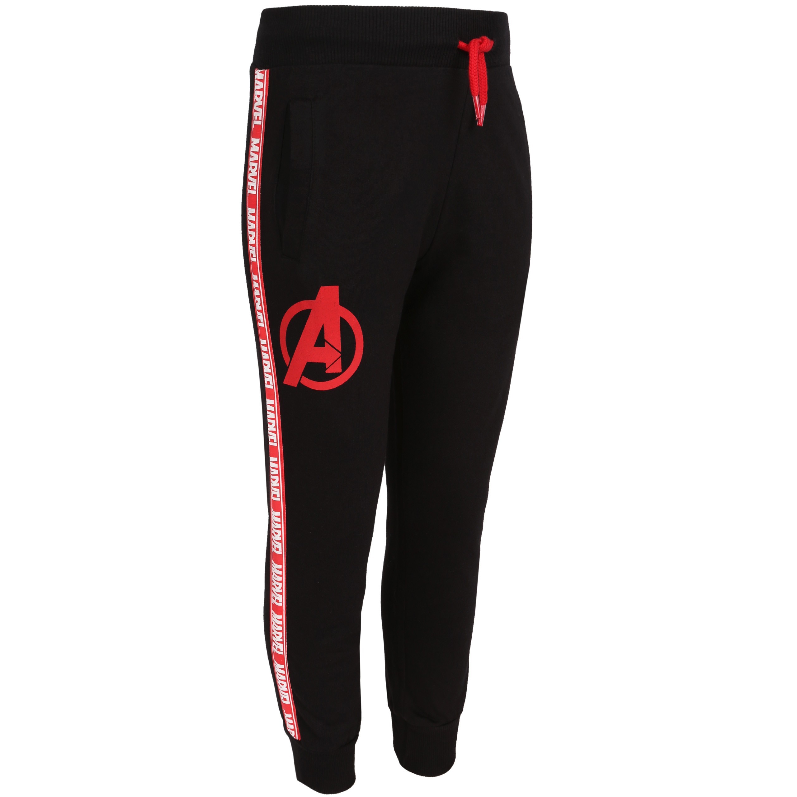 Czarne spodnie dresowe z przodu z nadrukiem symbolu grupy superbohaterów Avengers.