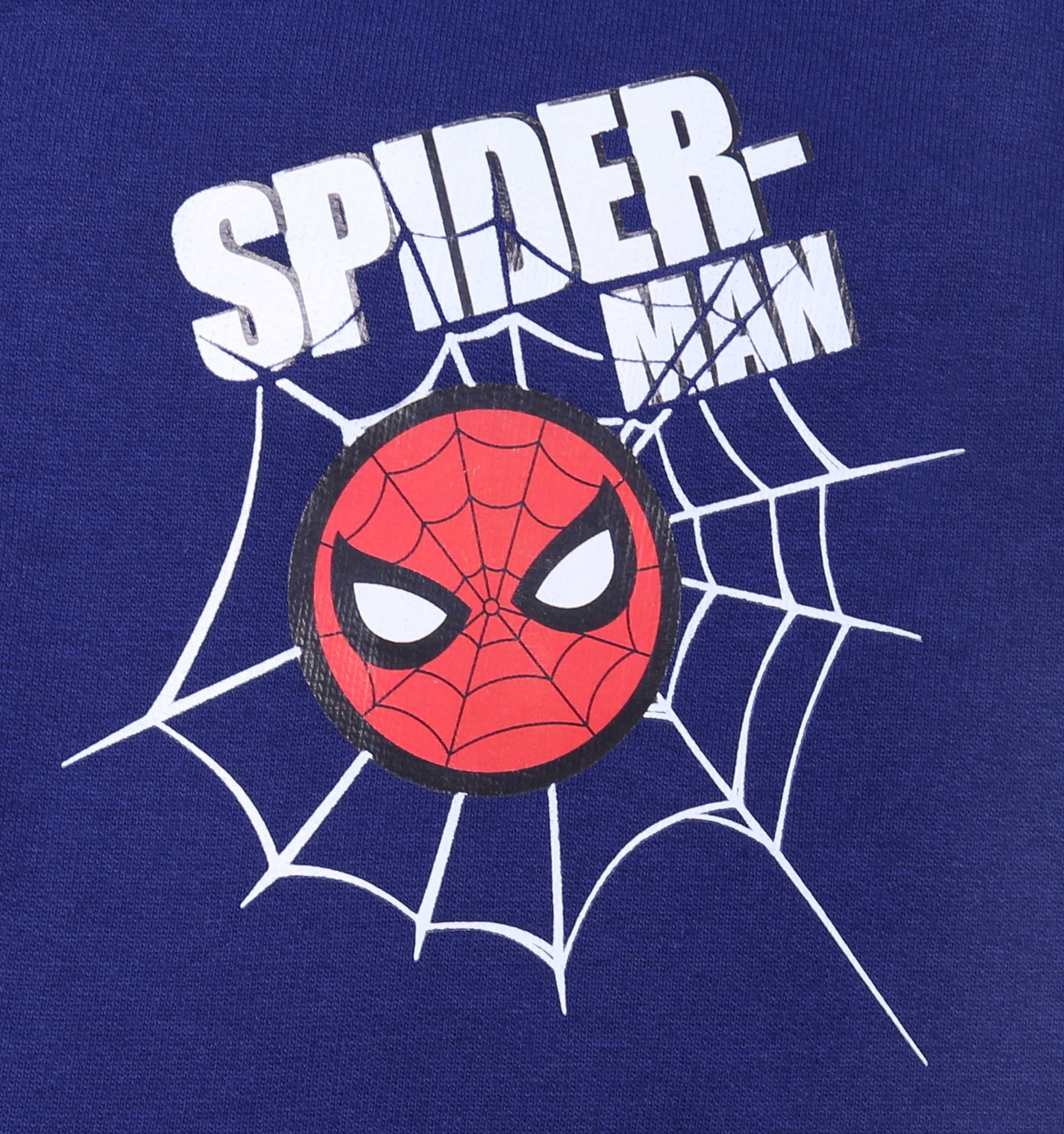 Granatowe, chłopięce szorty z motywem komiksu ''Spider-Man'', wyprodukowanego przez Marvel.