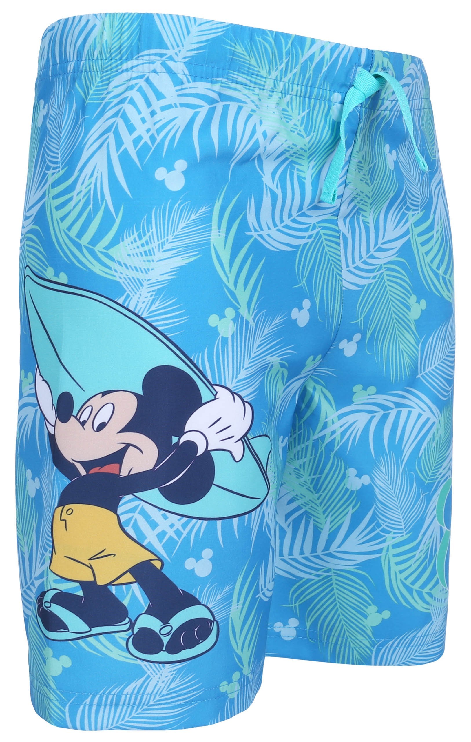 Niebieskie spodenki kąpielowe z motywem liści i wizerunkiem Myszki Mickey.