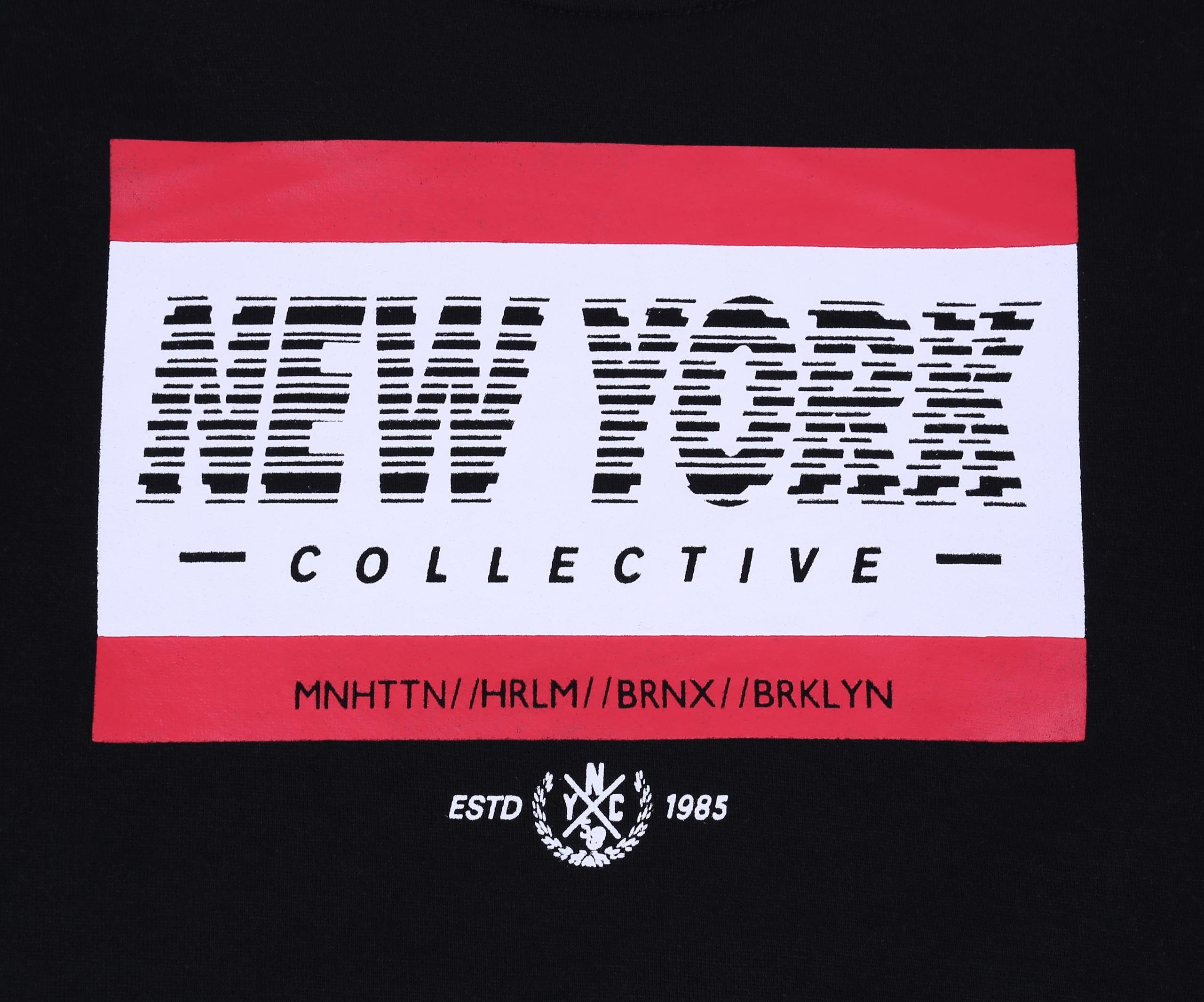 Czarna bluza wkładana przez głowę, z przodu z napisem 'New York Collective".