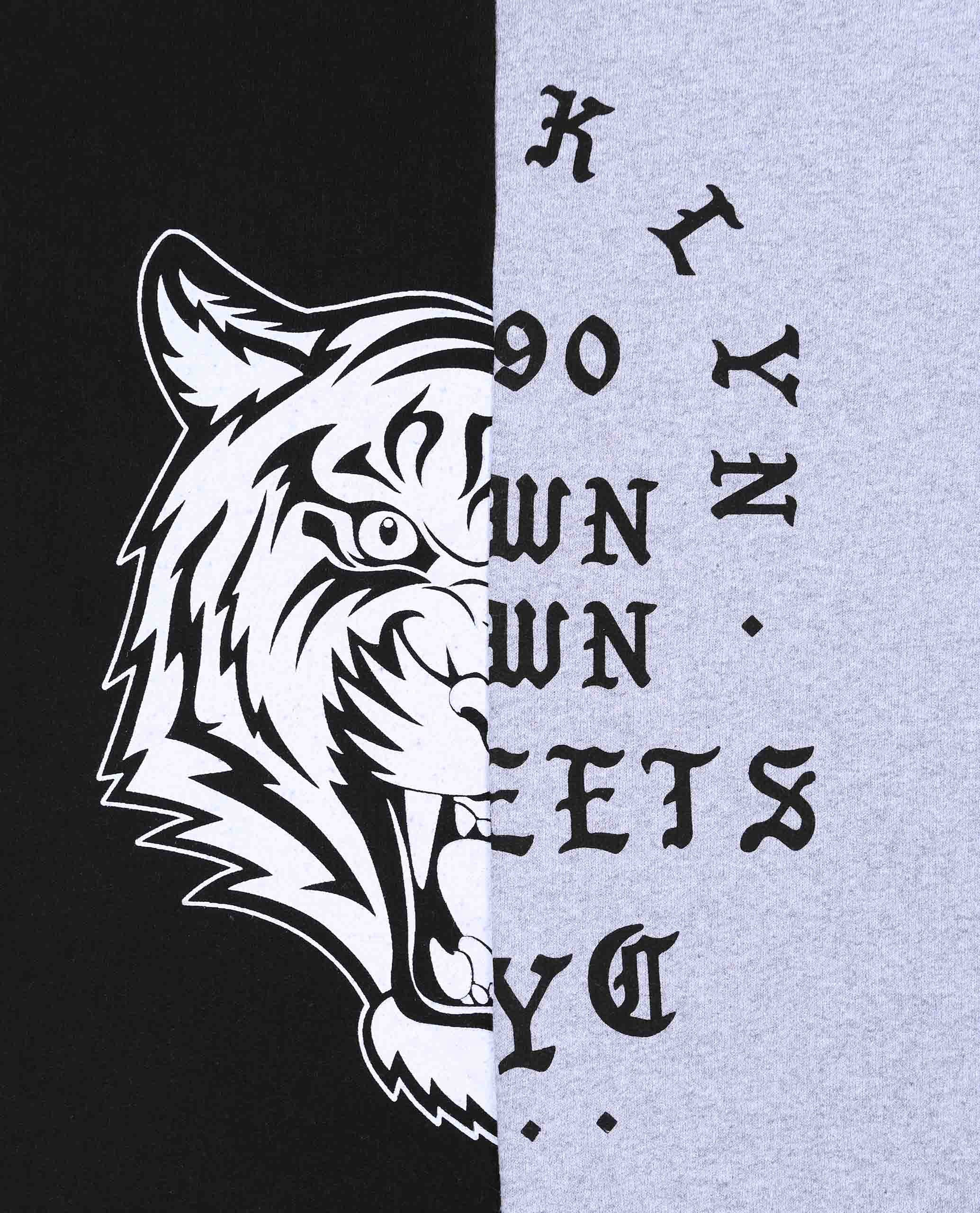 Dwukolorowa bluza wkładana przez głowę, na czarnej części nadruk