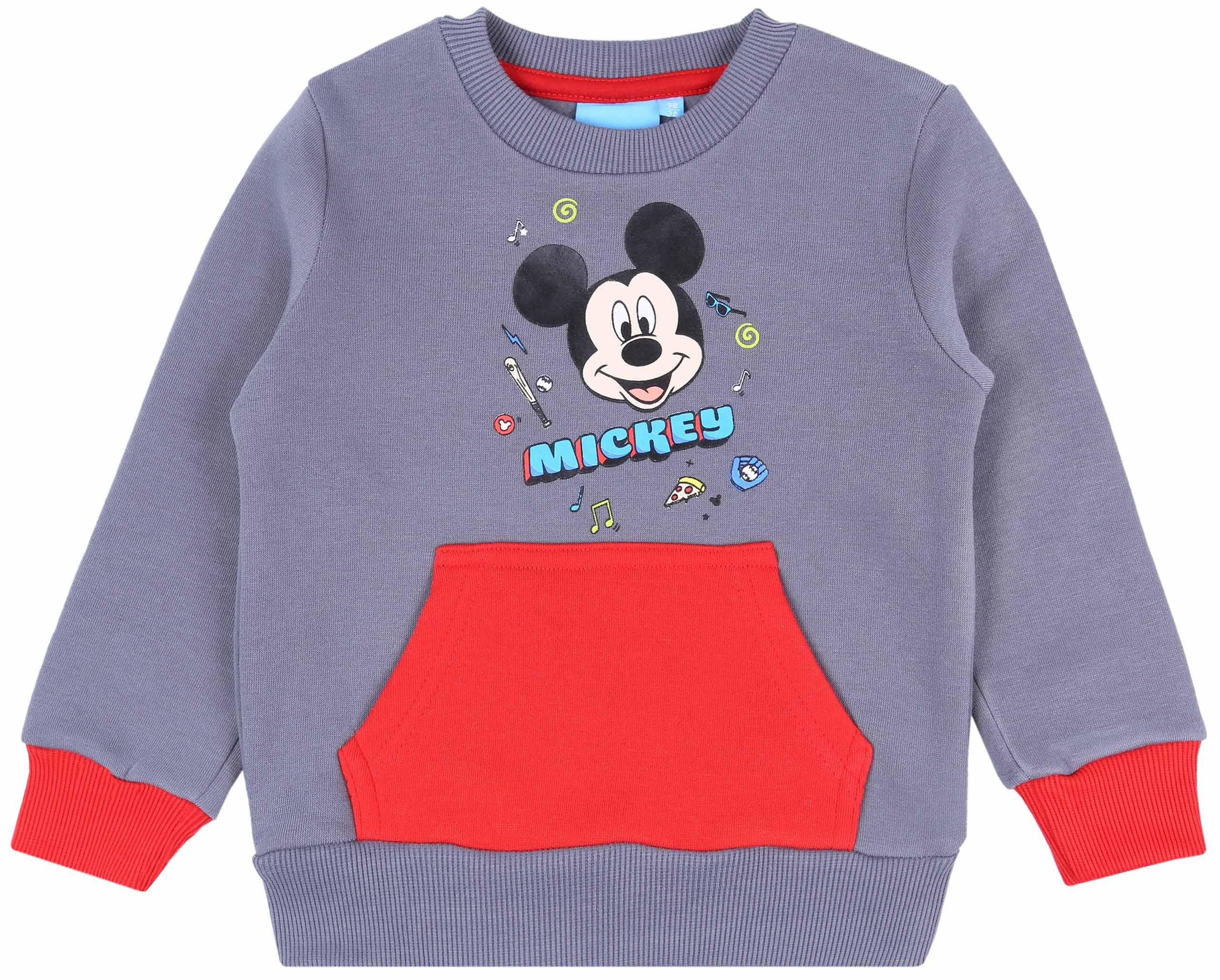 Szara bluza z wizerunkiem Myszki Mickey, rękawy, dekolt oraz dół wykończone ściągaczem,