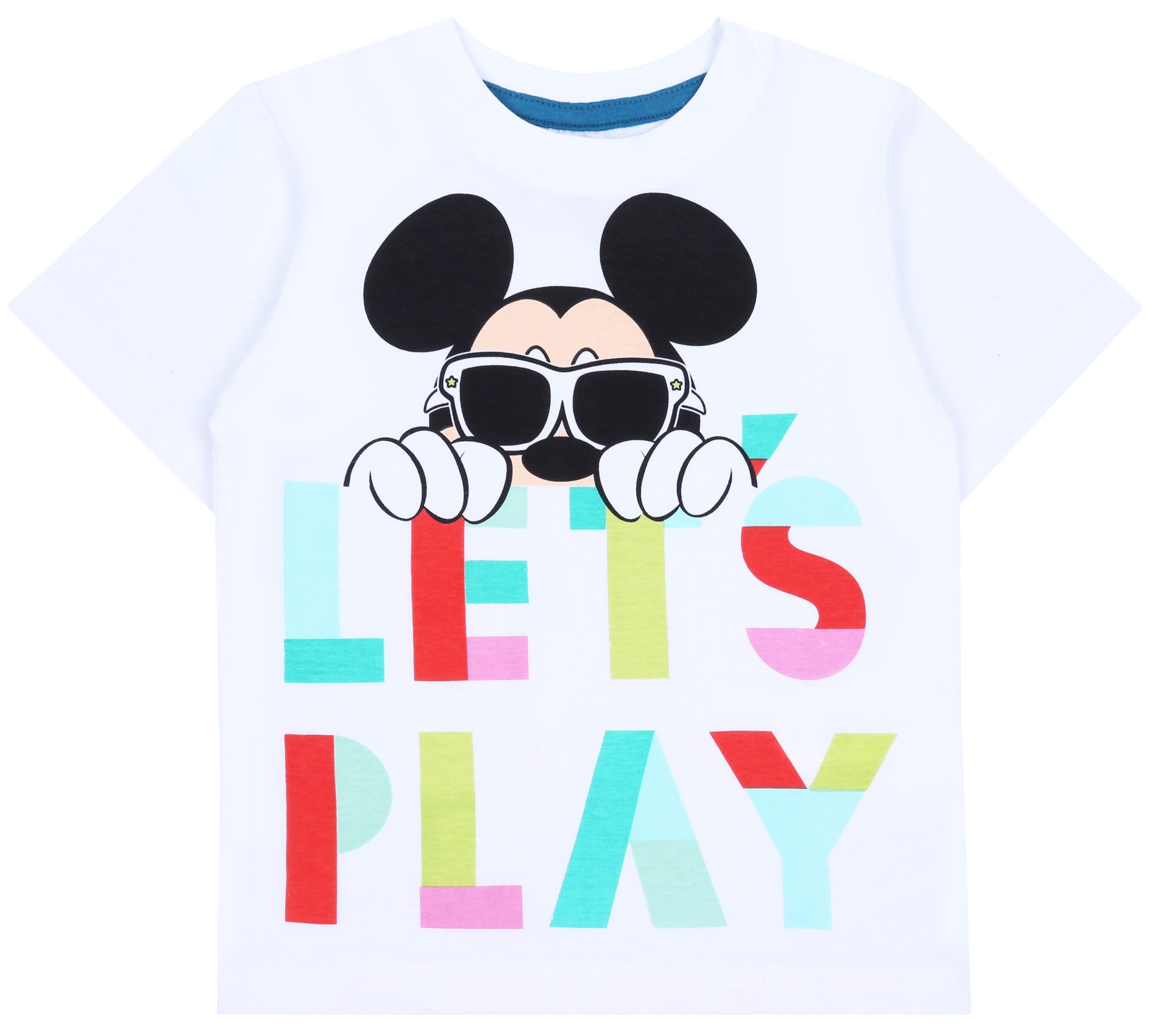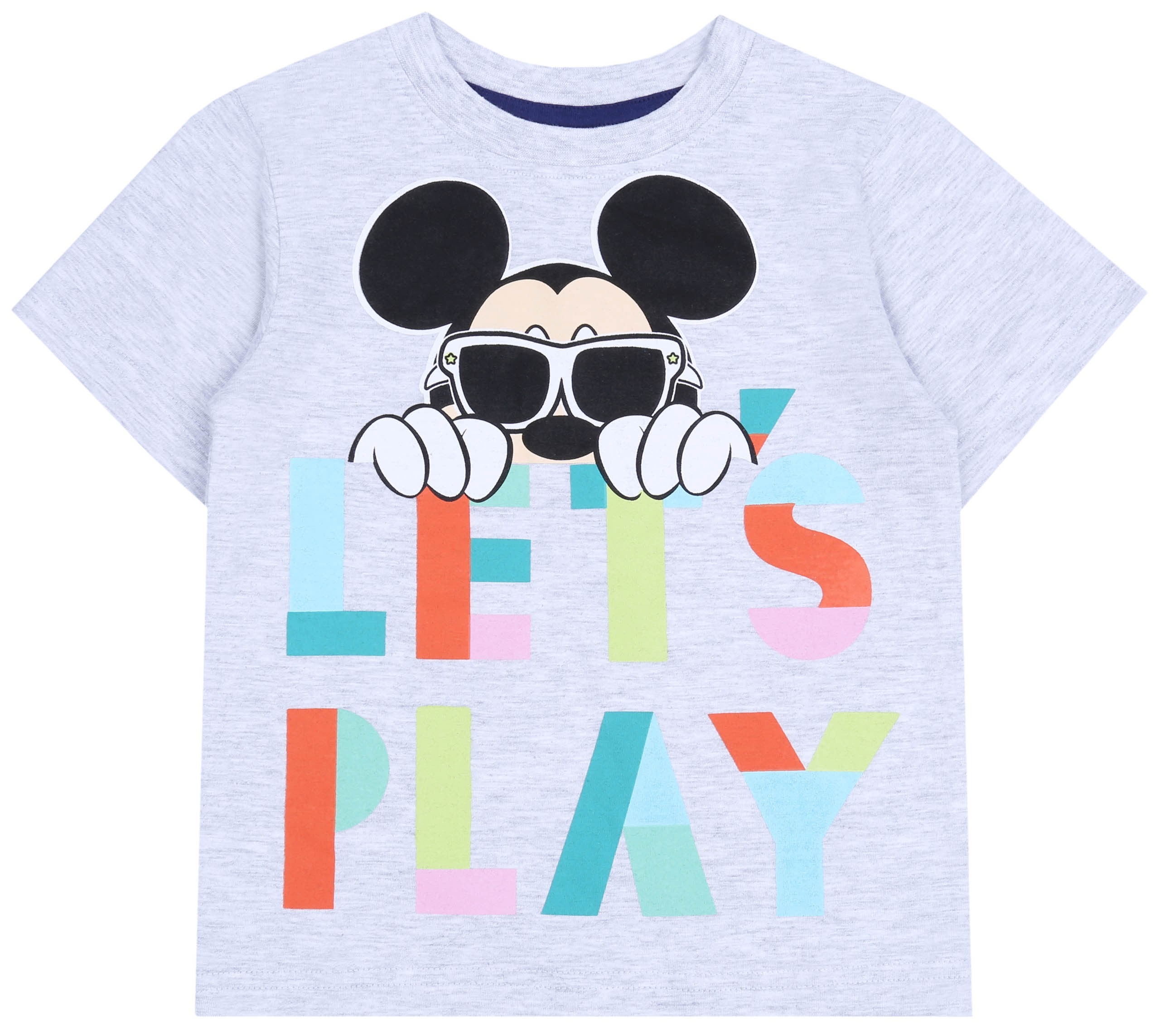 Szara koszulka z okrągłym dekoltem, motywem Myszki Mickey oraz napisem "LET'S PLAY".