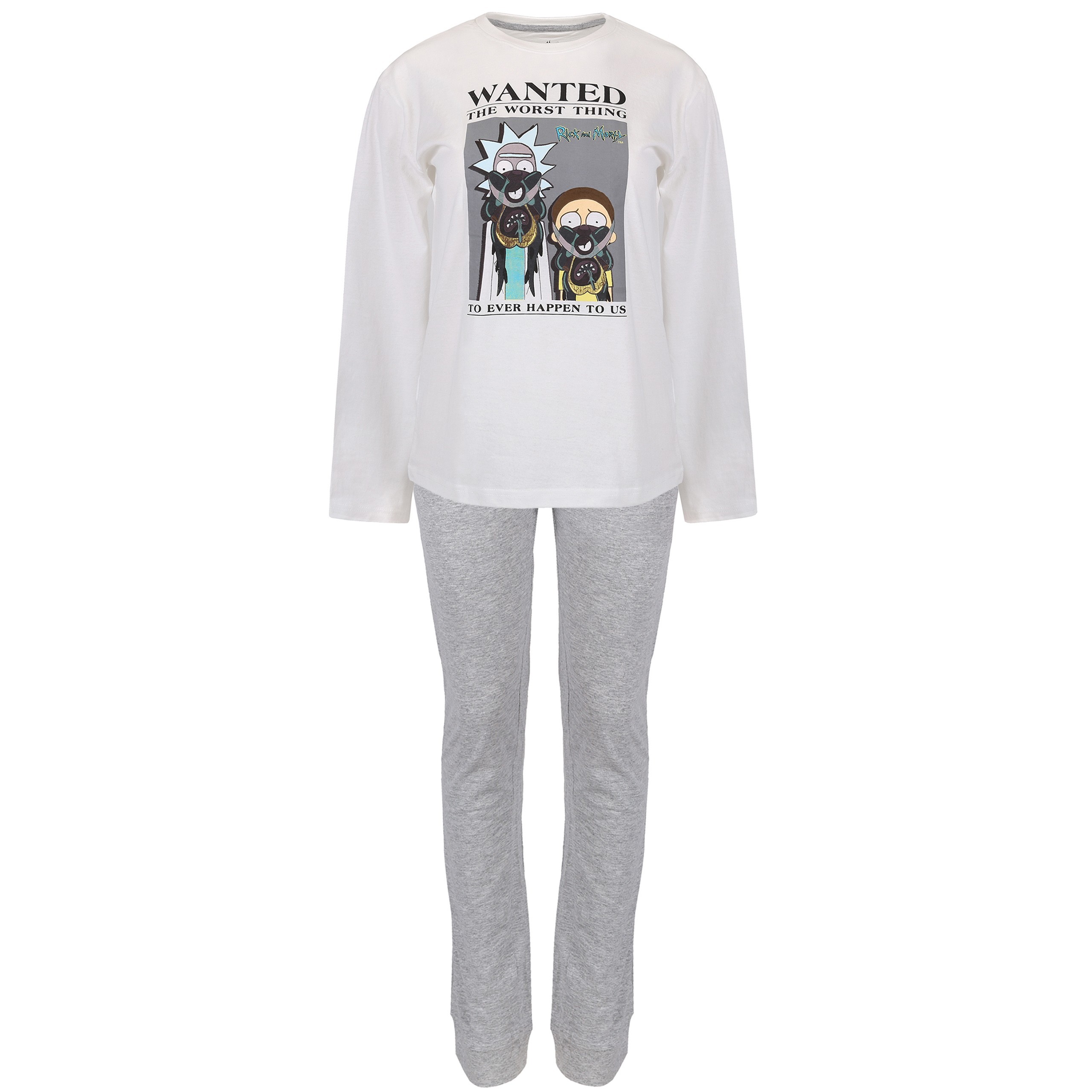 Biało-szara, długa piżama dwuczęściowa z nadrukiem bohaterów bajki Rick i Morty.