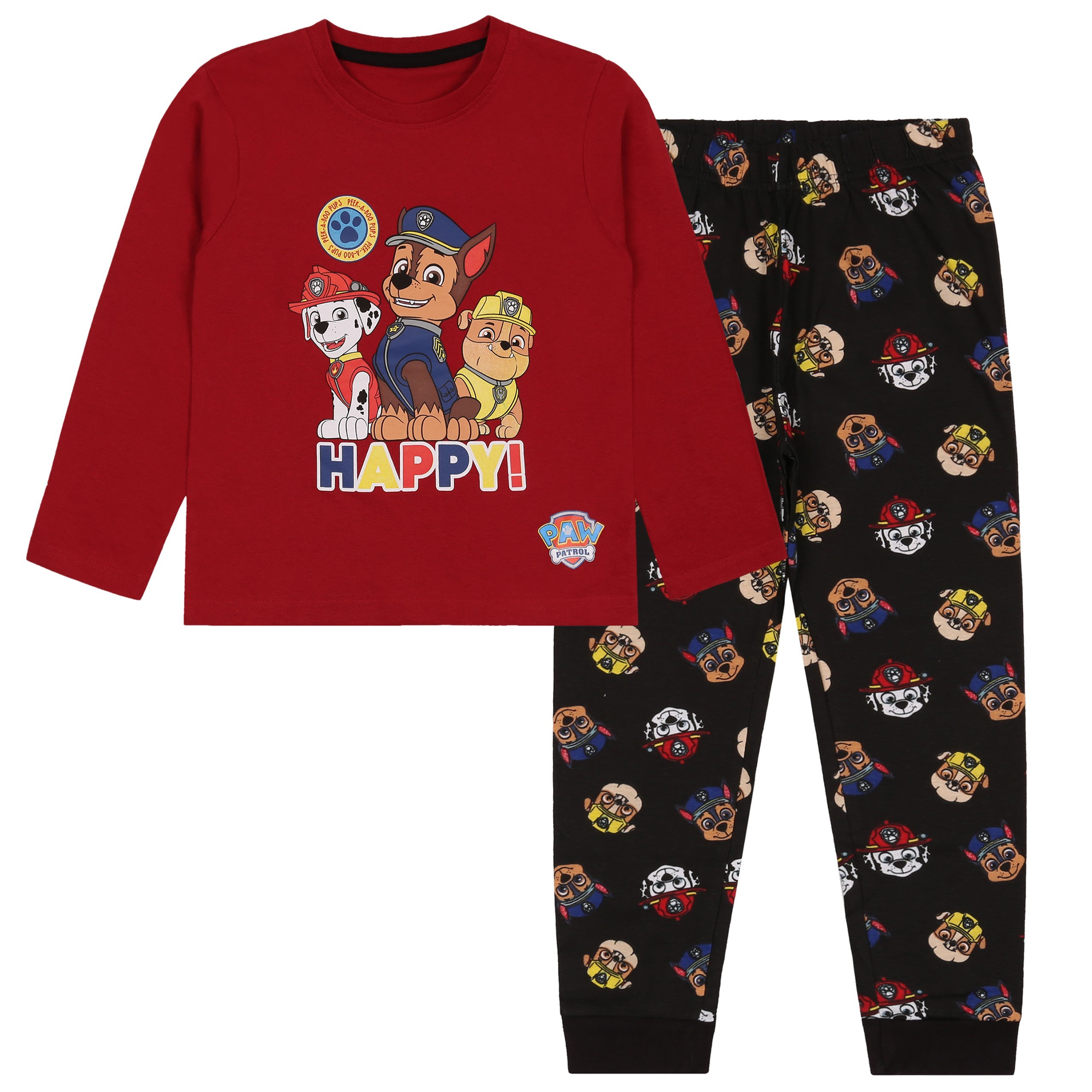 Czerwono-czarna, długa piżama dwuczęściowa z nadrukiem bohaterów bajki Psi Patrol.