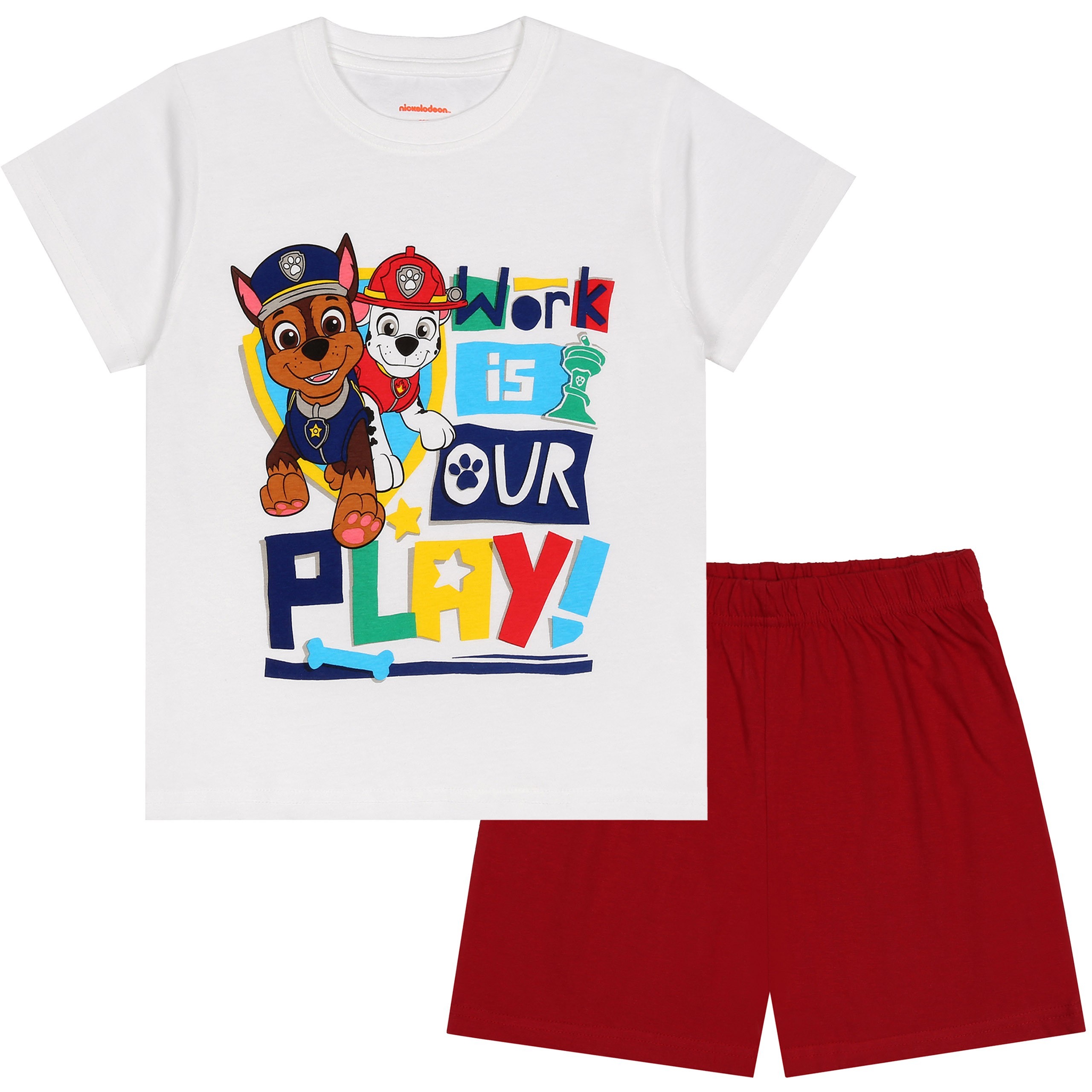 Piżama składa się z białej koszulki z krótkimi rękawami i czerwonych spodenek, tworząc stylowy i wygodny zestaw do spania.