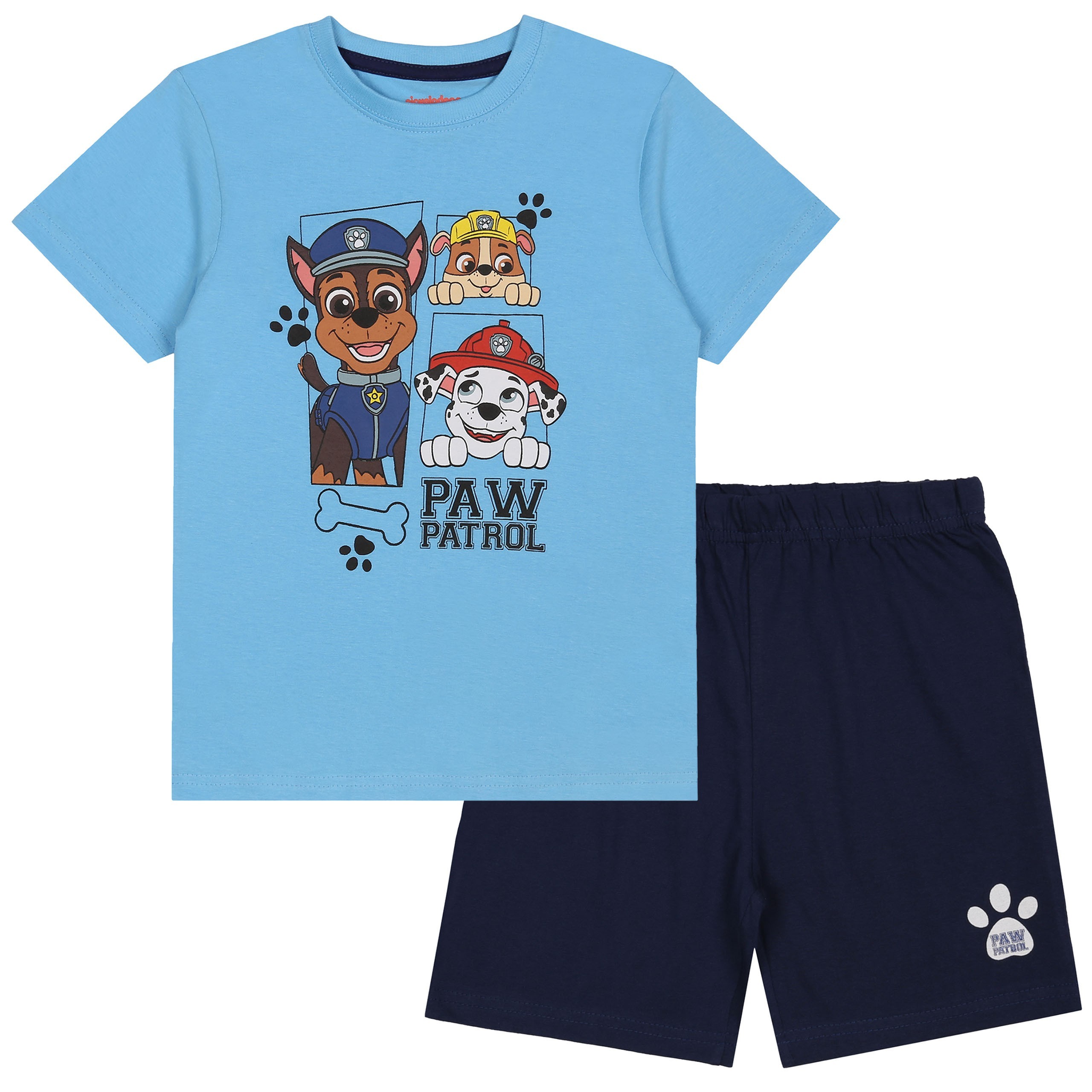 Piżama składa się z niebieskiej koszulki z krótkimi rękawami i granatowych spodenek, tworząc stylowy i wygodny zestaw do spania.