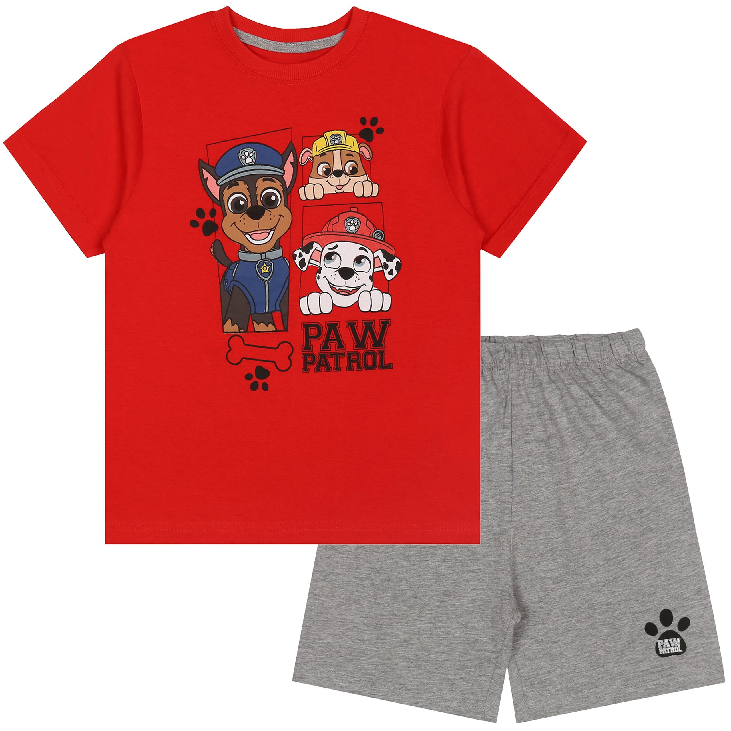 Piżama składa się z czerwonej koszulki z krótkimi rękawami i szarych spodenek, co tworzy stylowy i wygodny zestaw do spania.