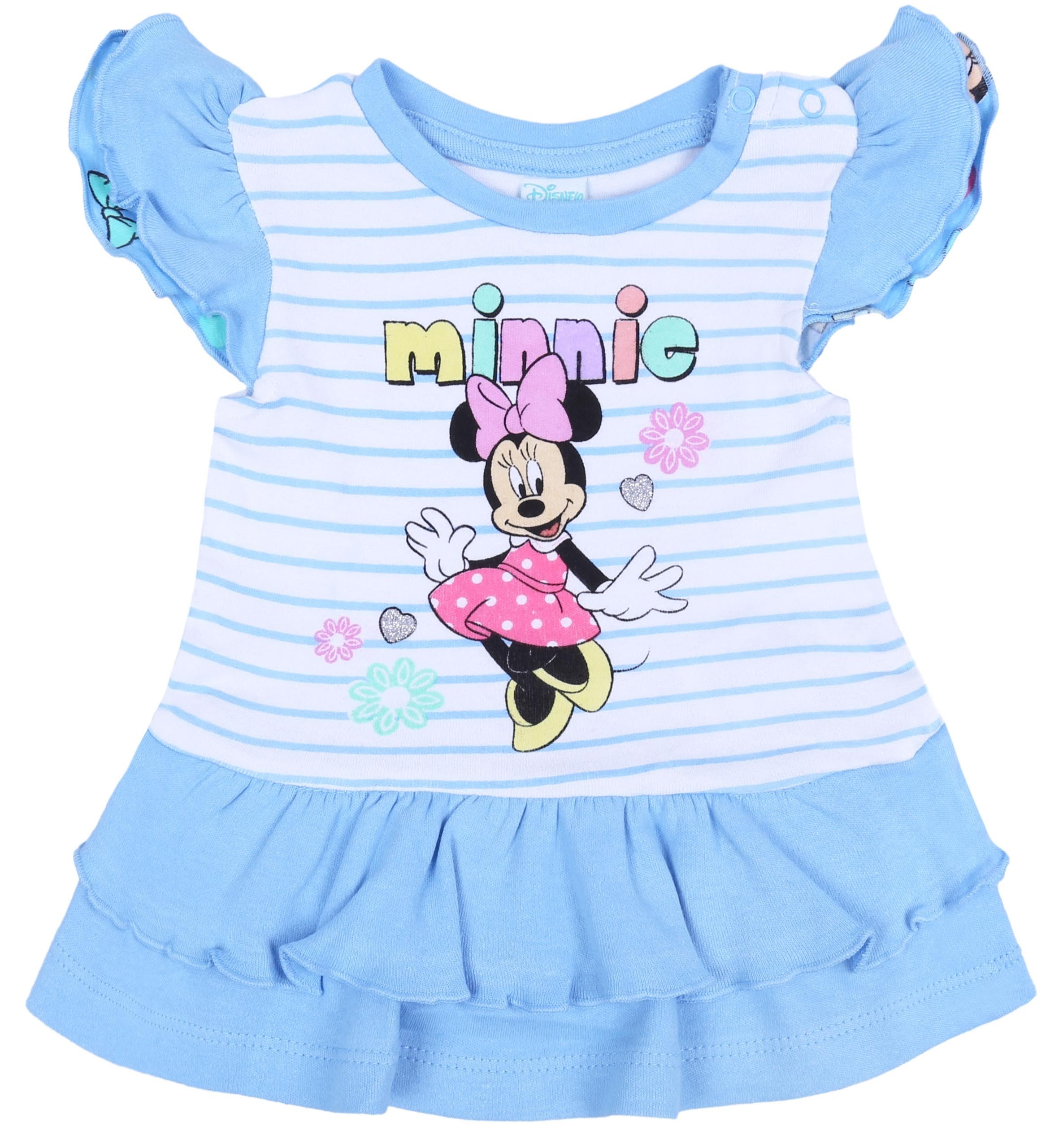 Niebieski komplet dziewczęcy składający się z tuniki w paski oraz spodenek z powtarzającym się motywem Myszki Minnie.