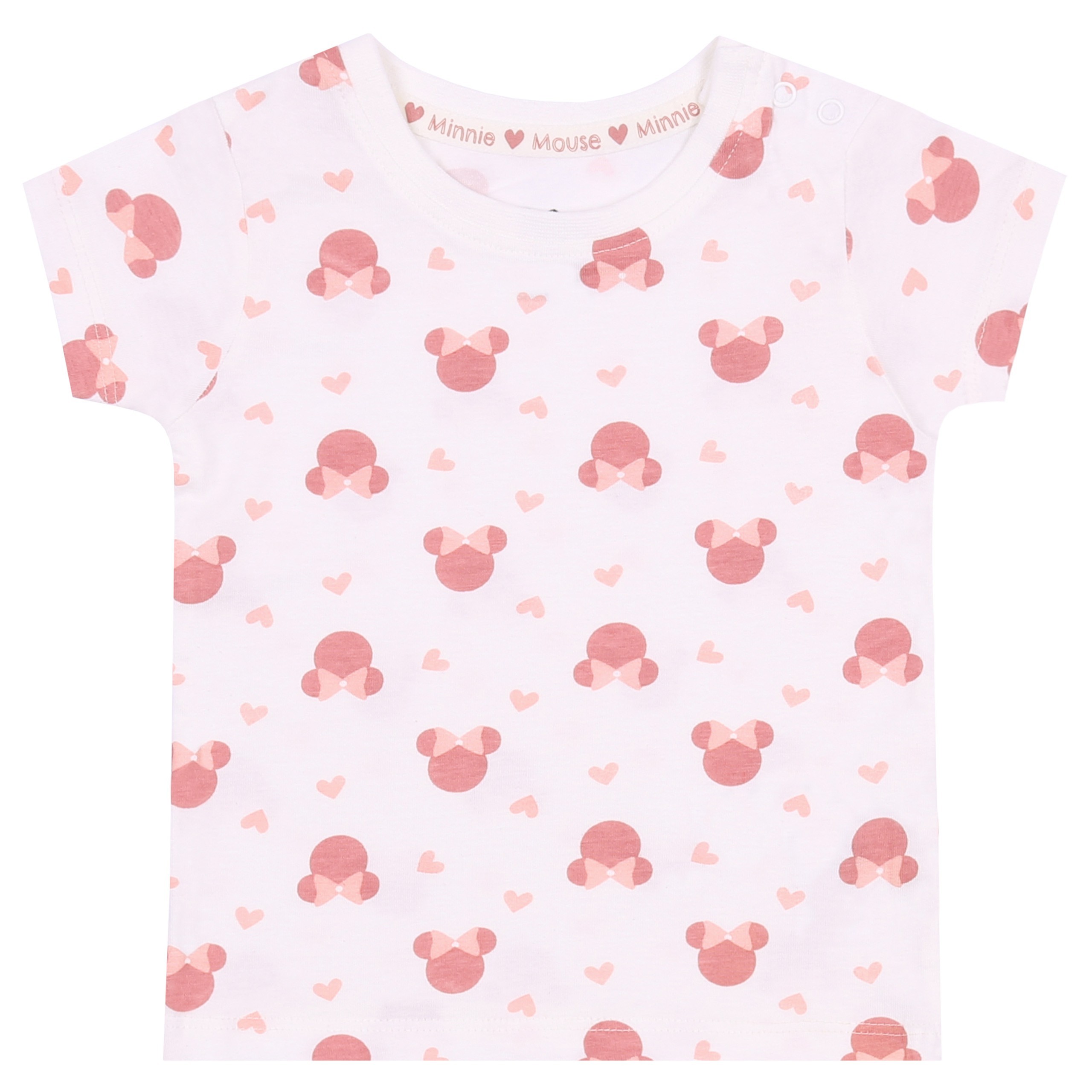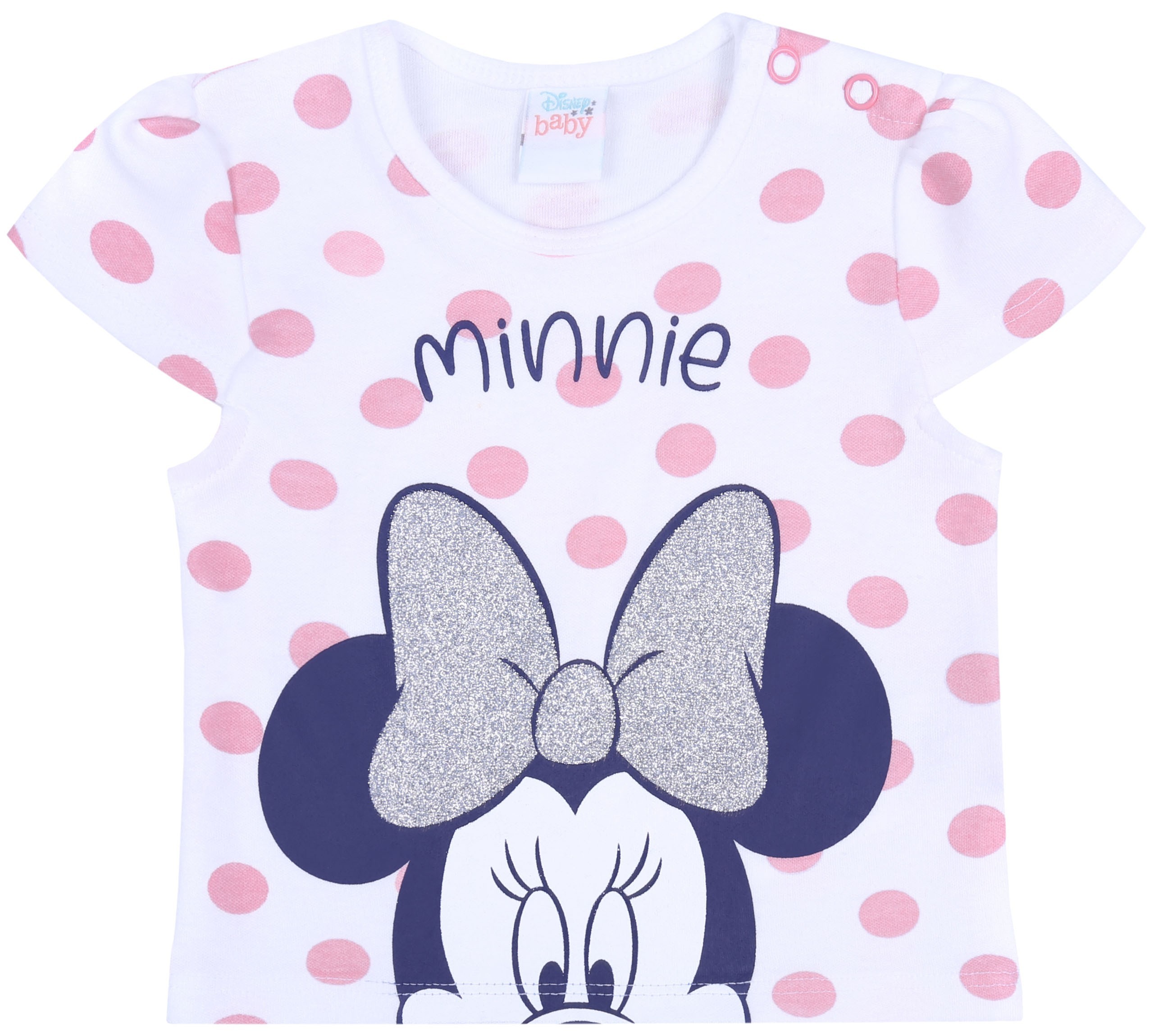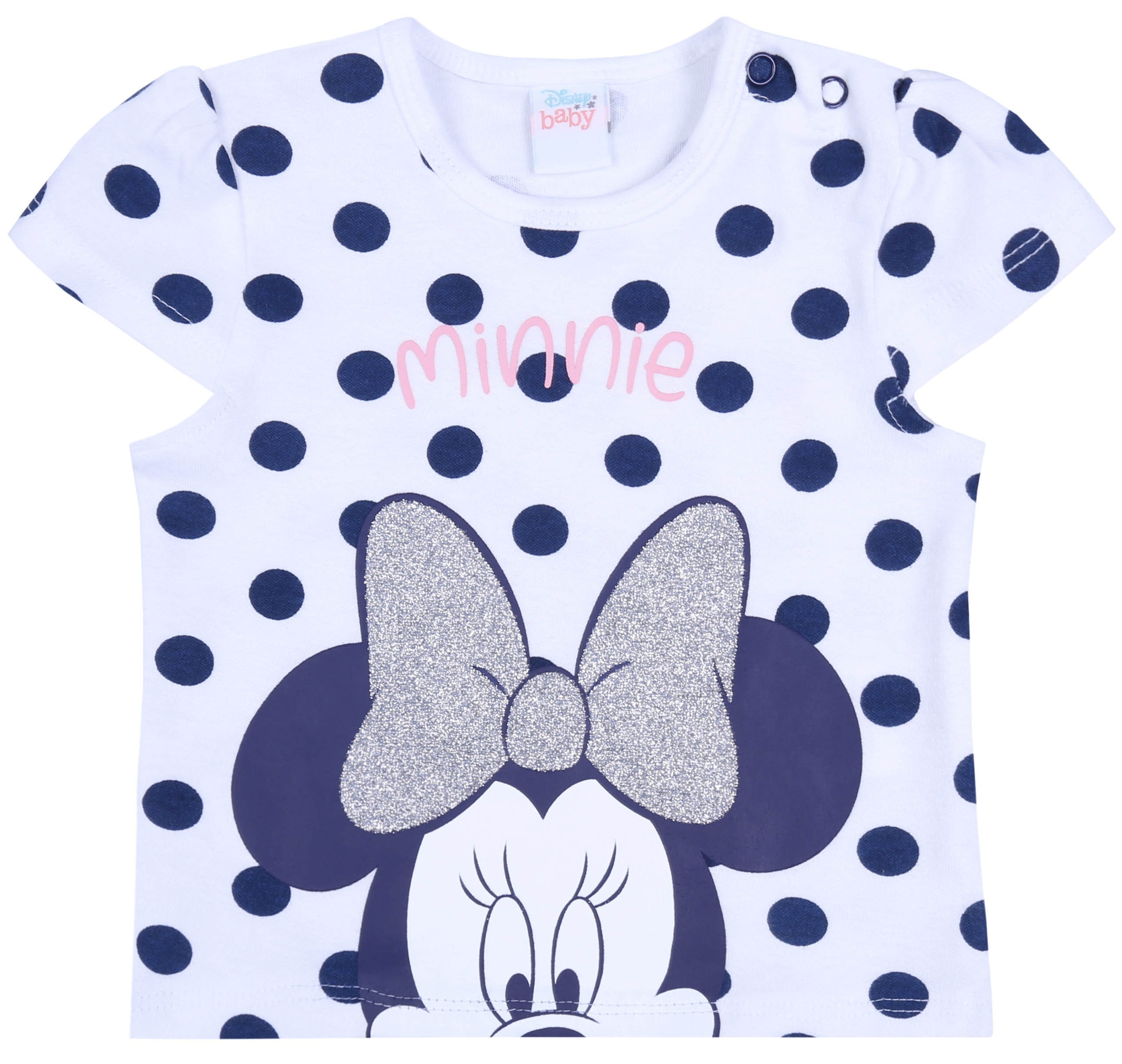 Bluzeczka ma klasyczny krój z krótkimi rękawkami i okrągłym dekoltem, na ramieniu są dwa zatrzaski ułatwiające przebieranie dziecka.