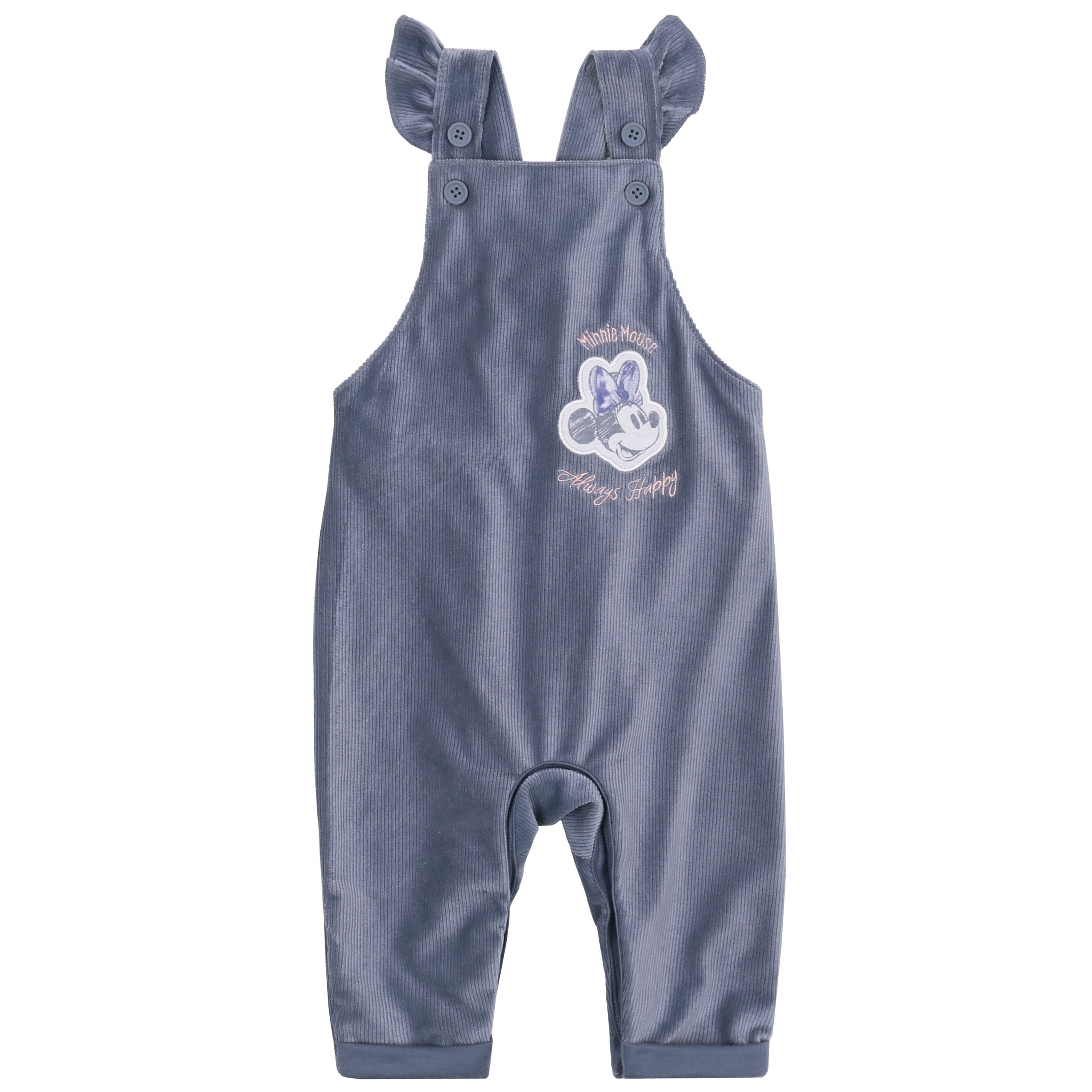 Różowo-niebieski komplet dla dziewczynki składający się z ogrodniczek i body, z motywem Myszki Minnie.