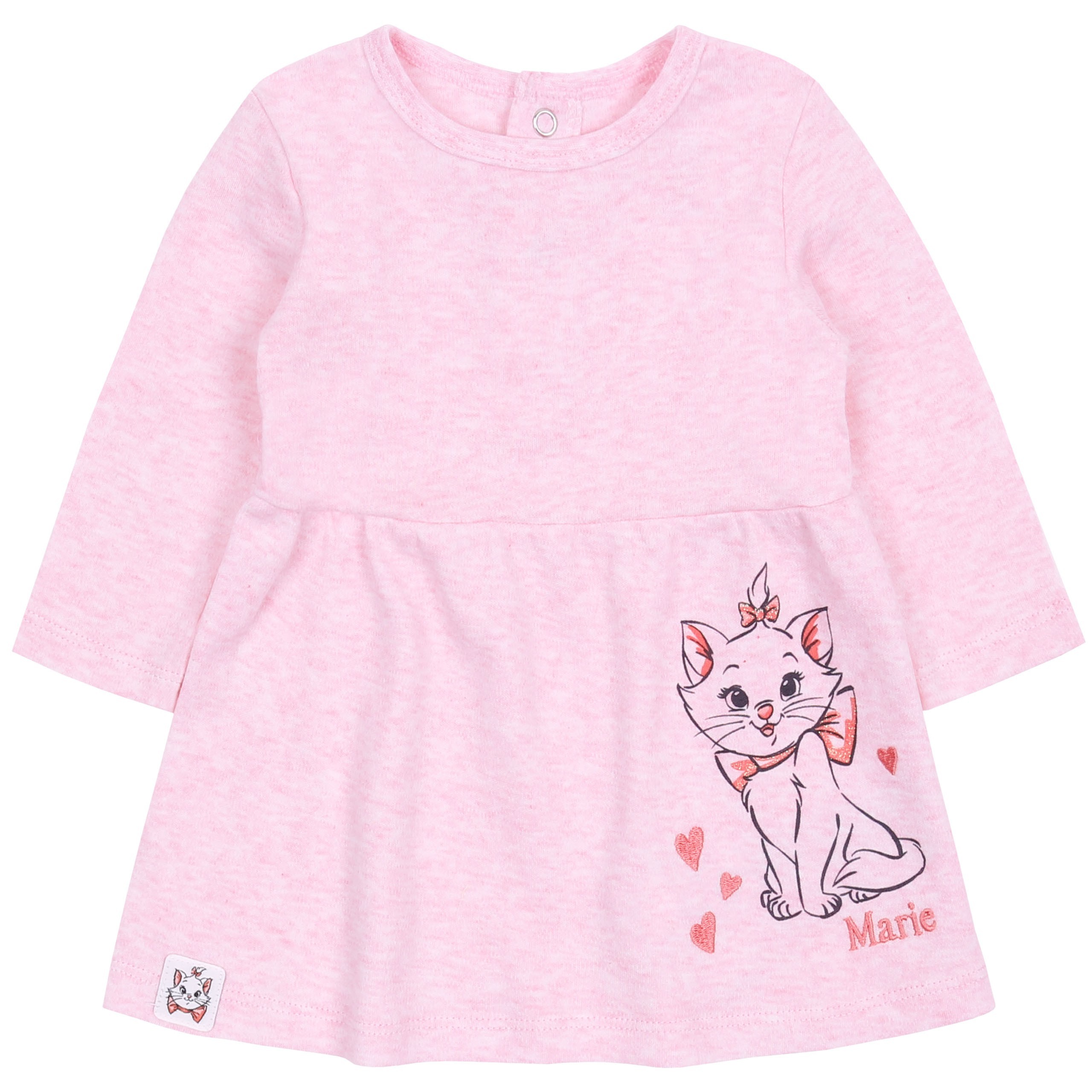 Sukienka z długimi rękawkami, z tyłu zapinana na zatrzaski, z przodu wizerunek Kotki Marie.
