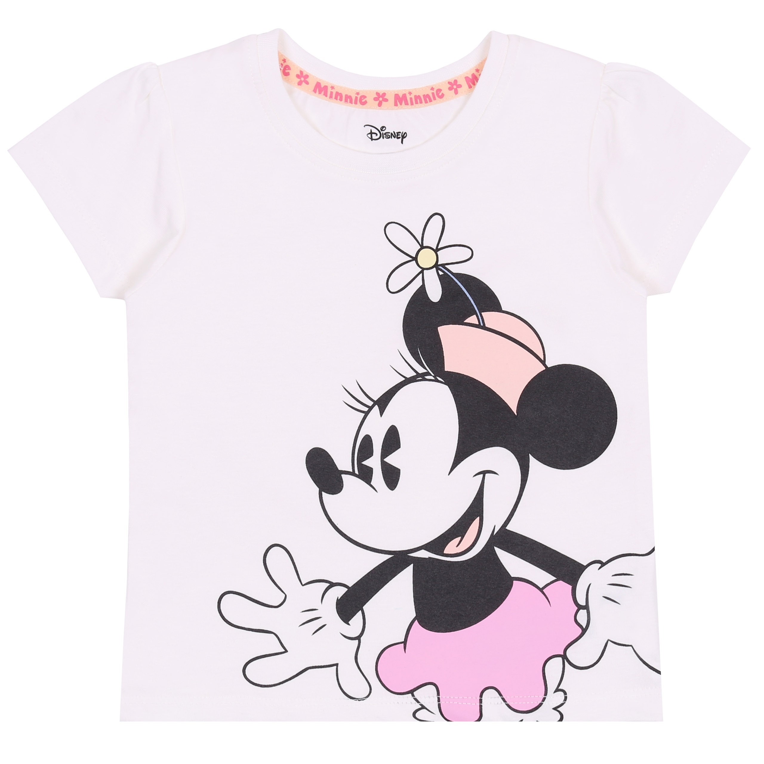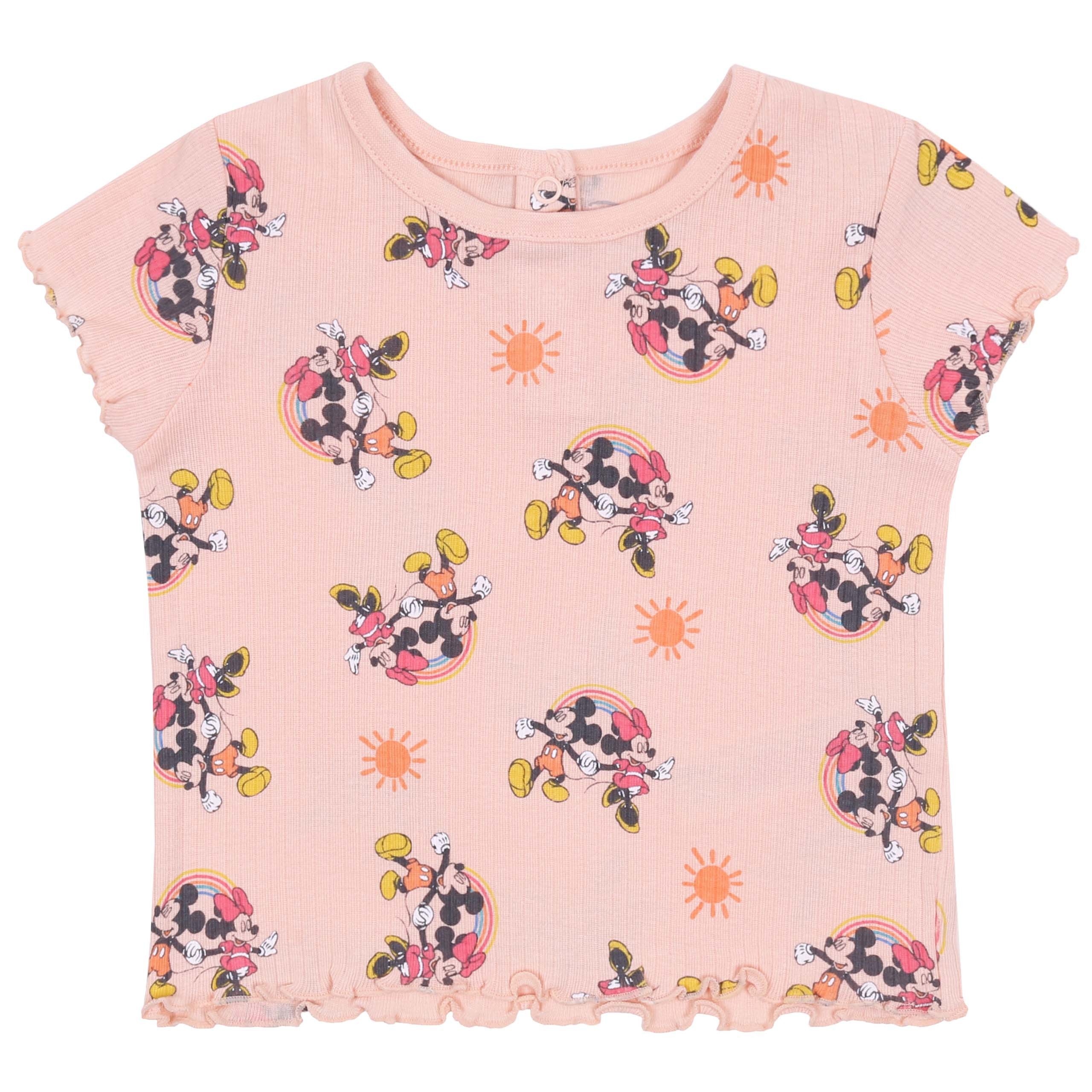 Śliczny komplet dla dziewczynki składający się ze spodenek typu ogrodniczki oraz koszulki z motywem Myszki Minnie.