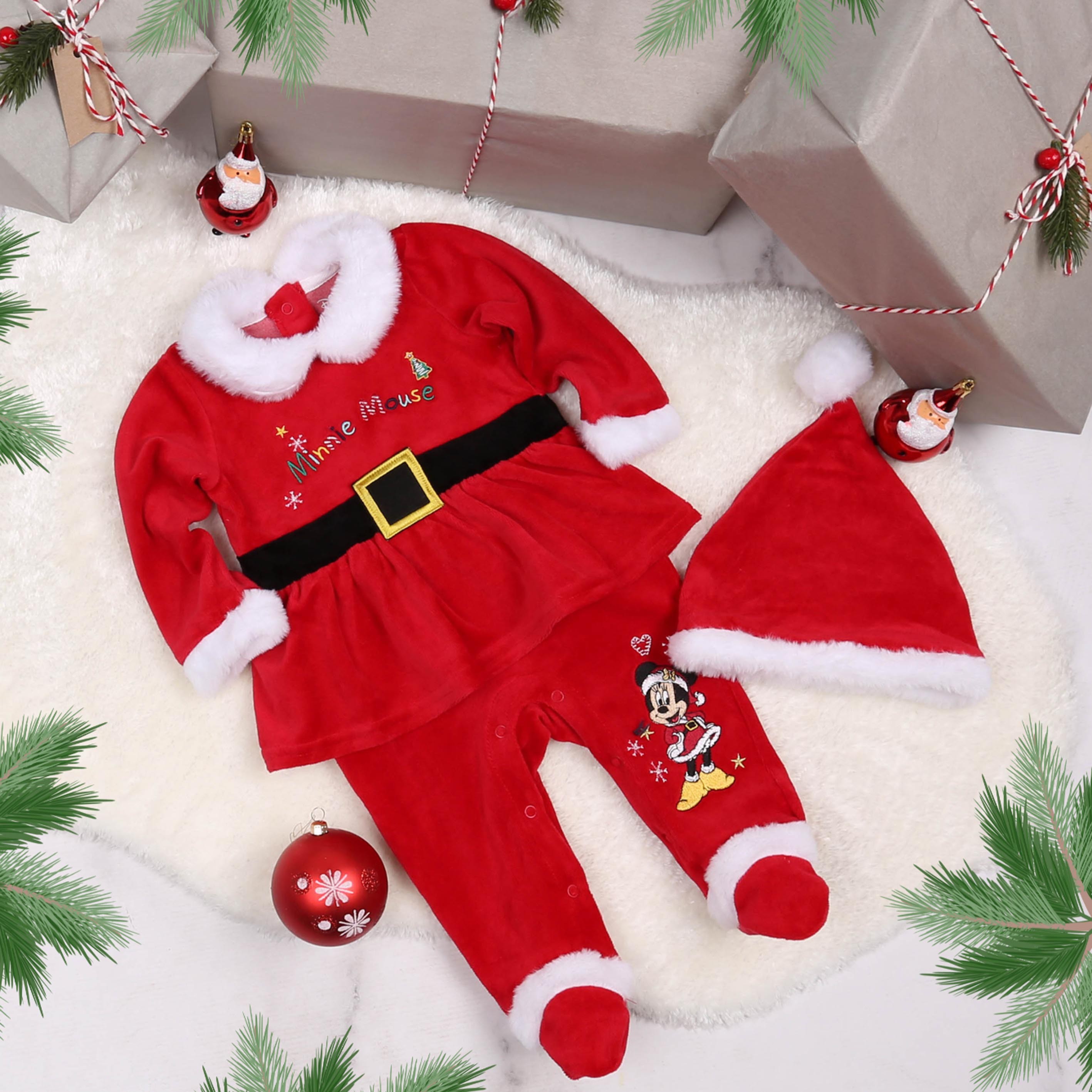 Świąteczny, welurowy komplet niemowlęcy składający się z pajacyka i czapeczki, na wzór stroju mikołajki.