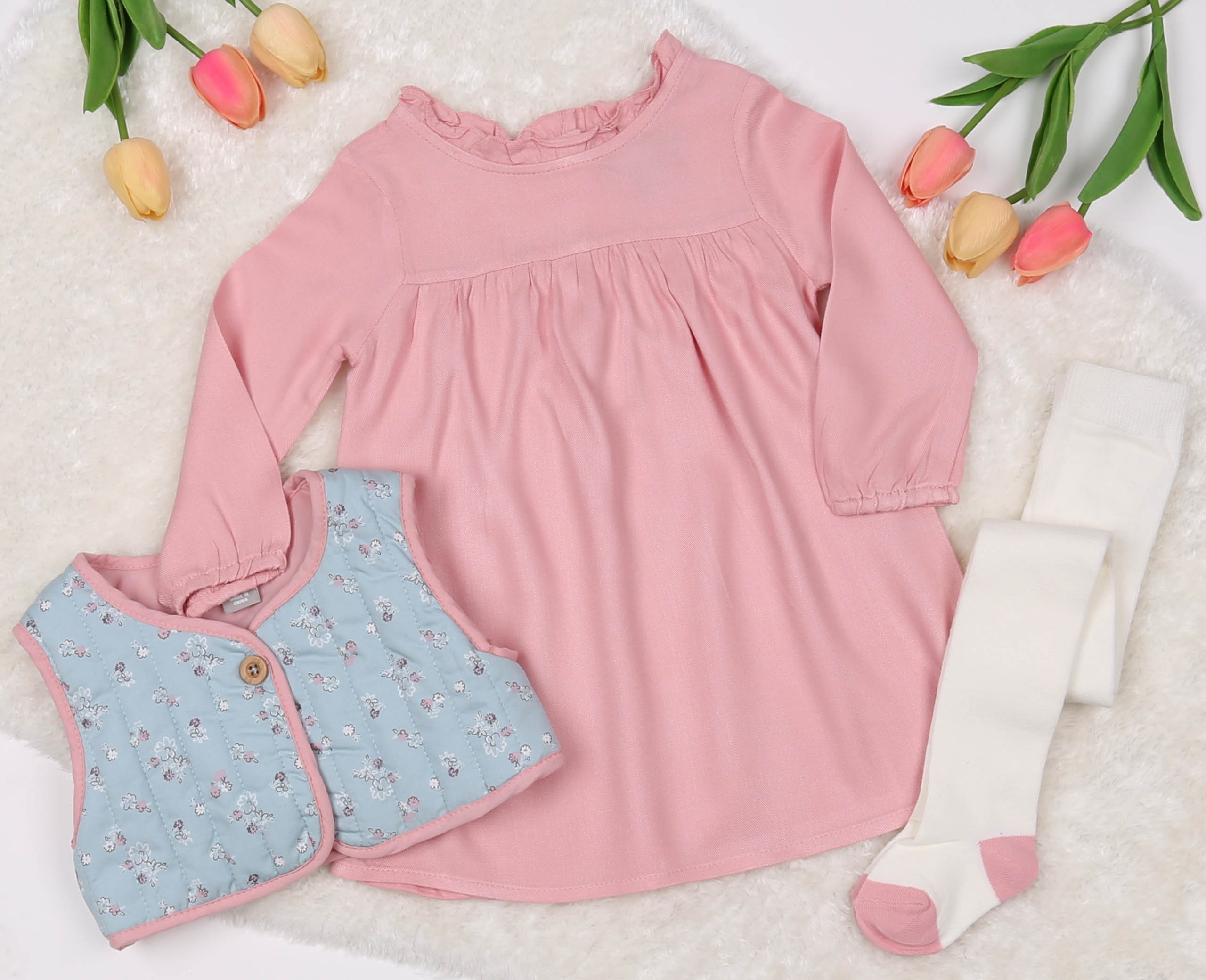 Różowo-niebieski komplet niemowlęcy dla dziewczynki składający się z sukienki, kamizelki i rajstopek. Różowa, gładka sukienka z rękawkami wykończonymi gumką. okrągły dekolt ozdobiony falbanką. Jasnoniebieska, pikowana kamizelka w drobne kwiatuszki, zapinana na guziczek. Kamizelka obszyta różową lamówką.
