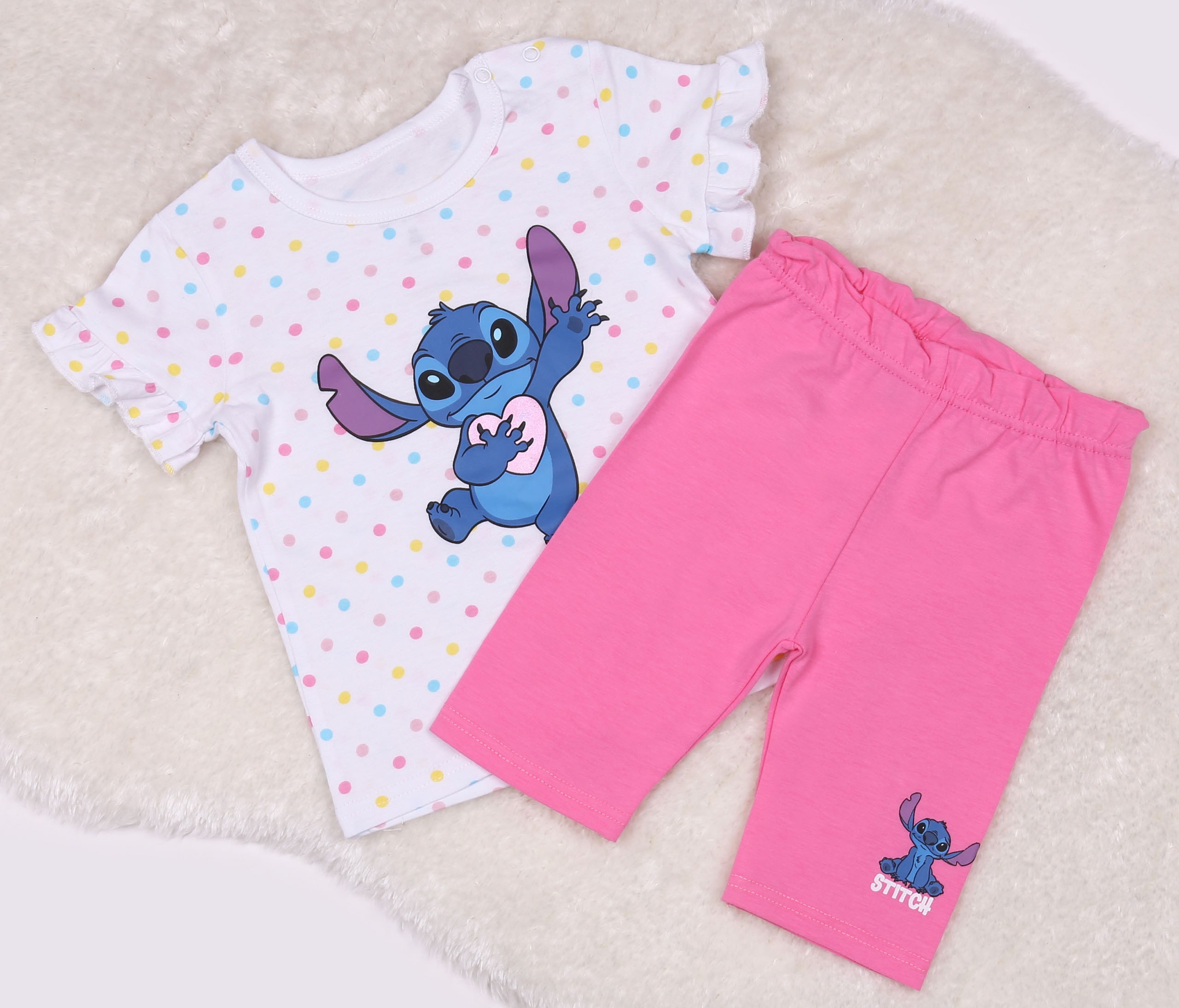 Biało-różowy, bawełniany komplet niemowlęcy w powtarzający się motyw kropek oraz wizerunkiem Stitcha.
