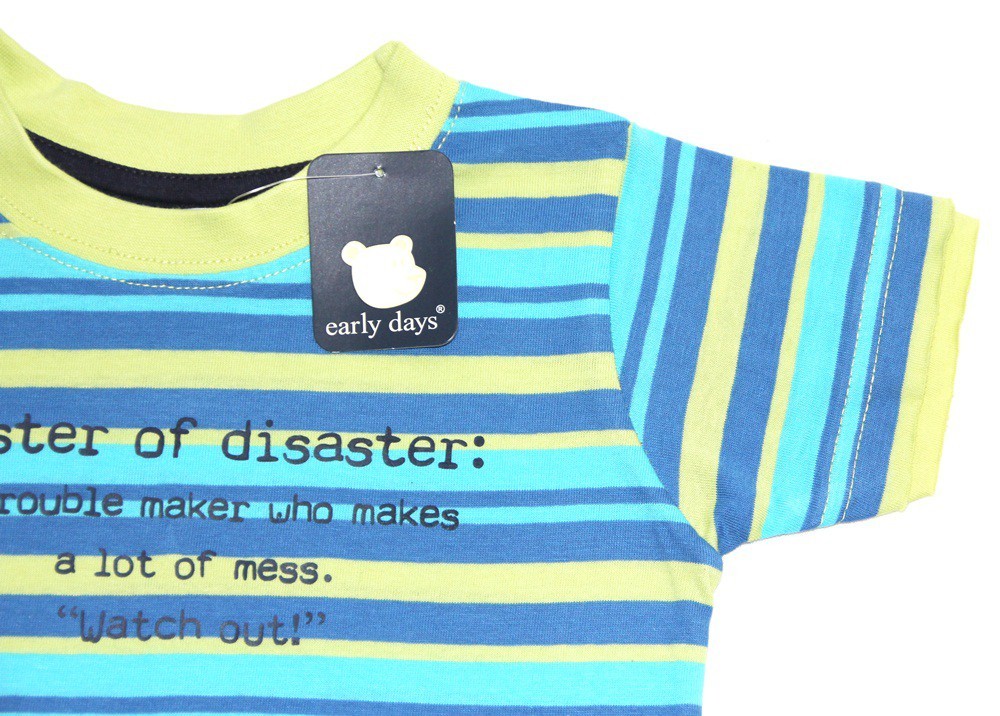 Zielono-niebieska, chłopięca koszulka w paski, z przodu z czarnym napisem.