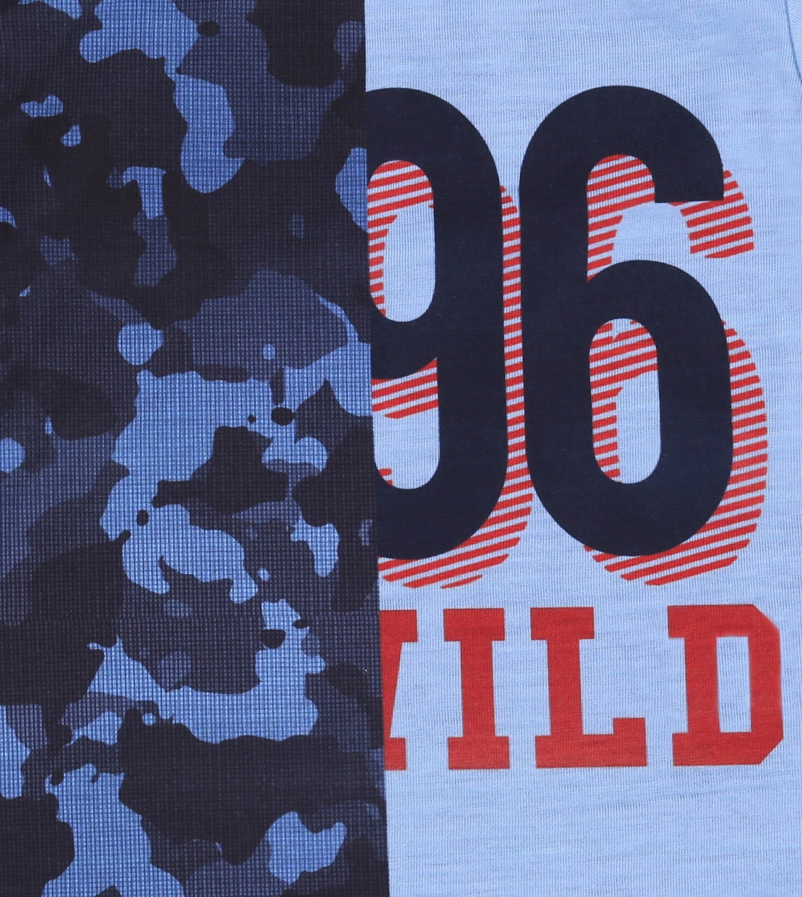 Niebieska koszulka na krótki rękaw we wzór moro.