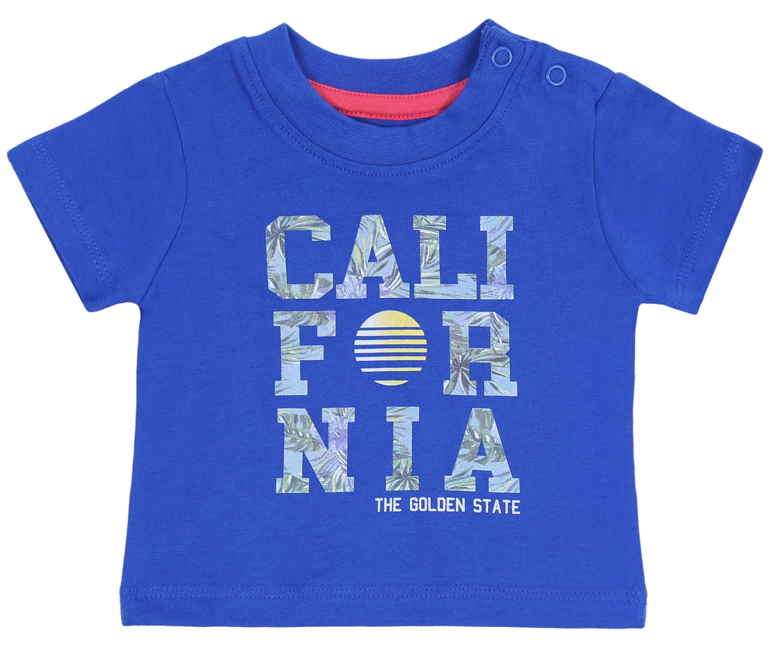 Jeden t-shirt niebieski z napisem CALIFORNIA, drugi biały w czerwone paski.