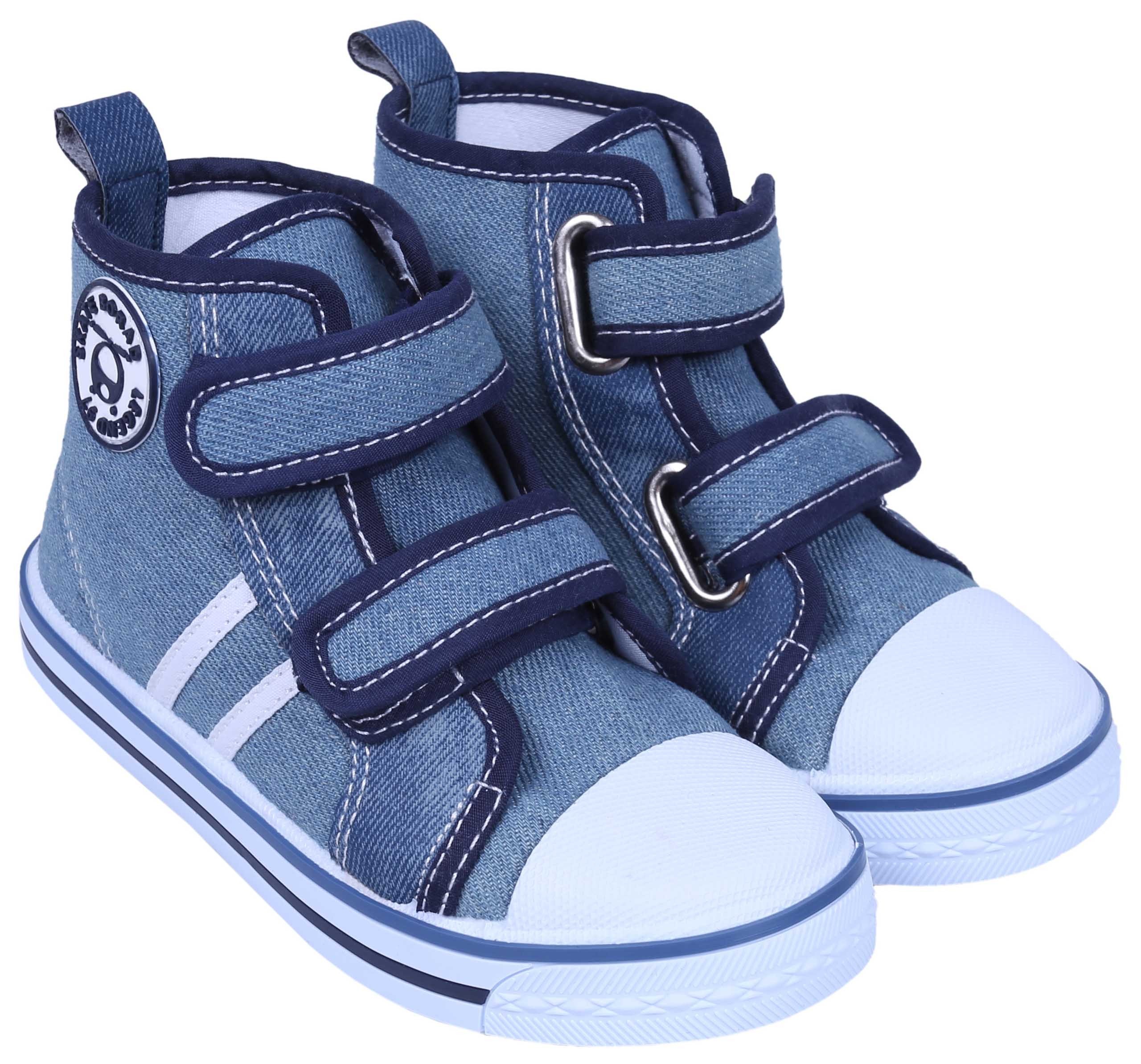 Jasnogranatowe, chłopięce trampki zapinane na dwa rzepy, co pozwala na dopasowanie do każdej dziecięcej stopy.