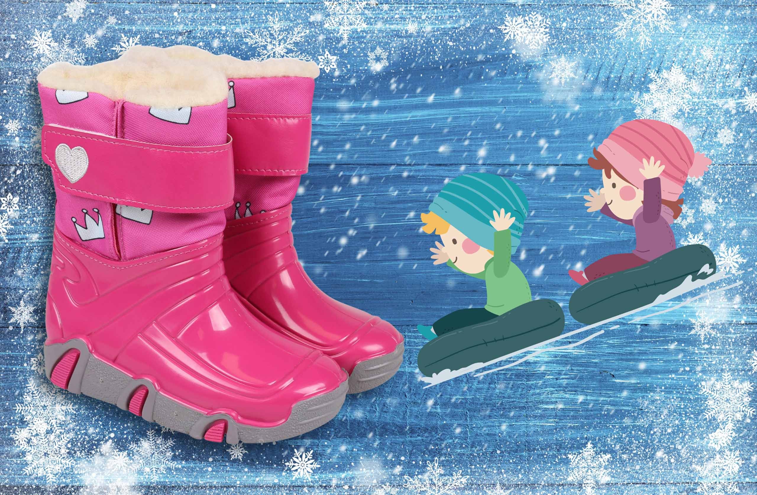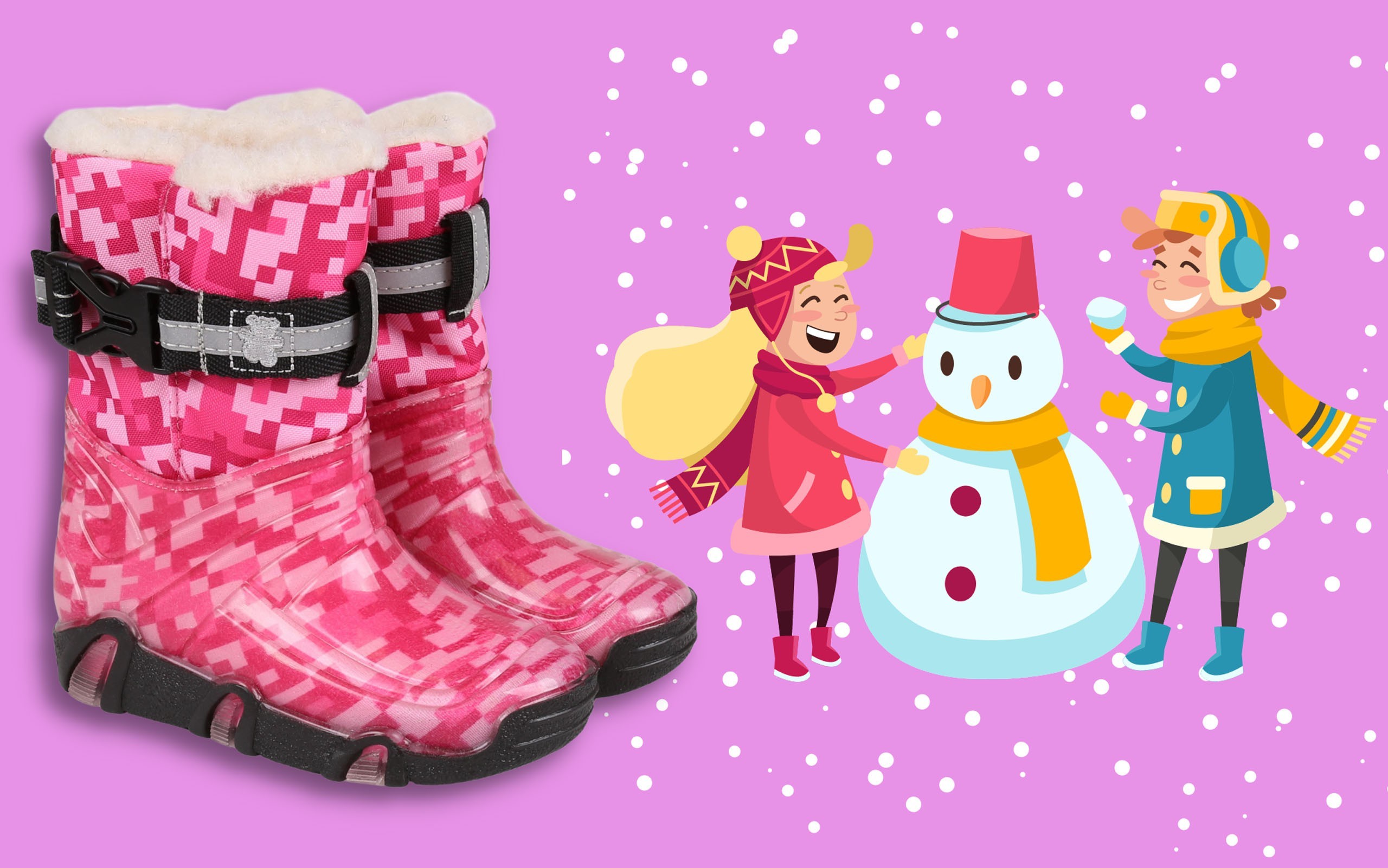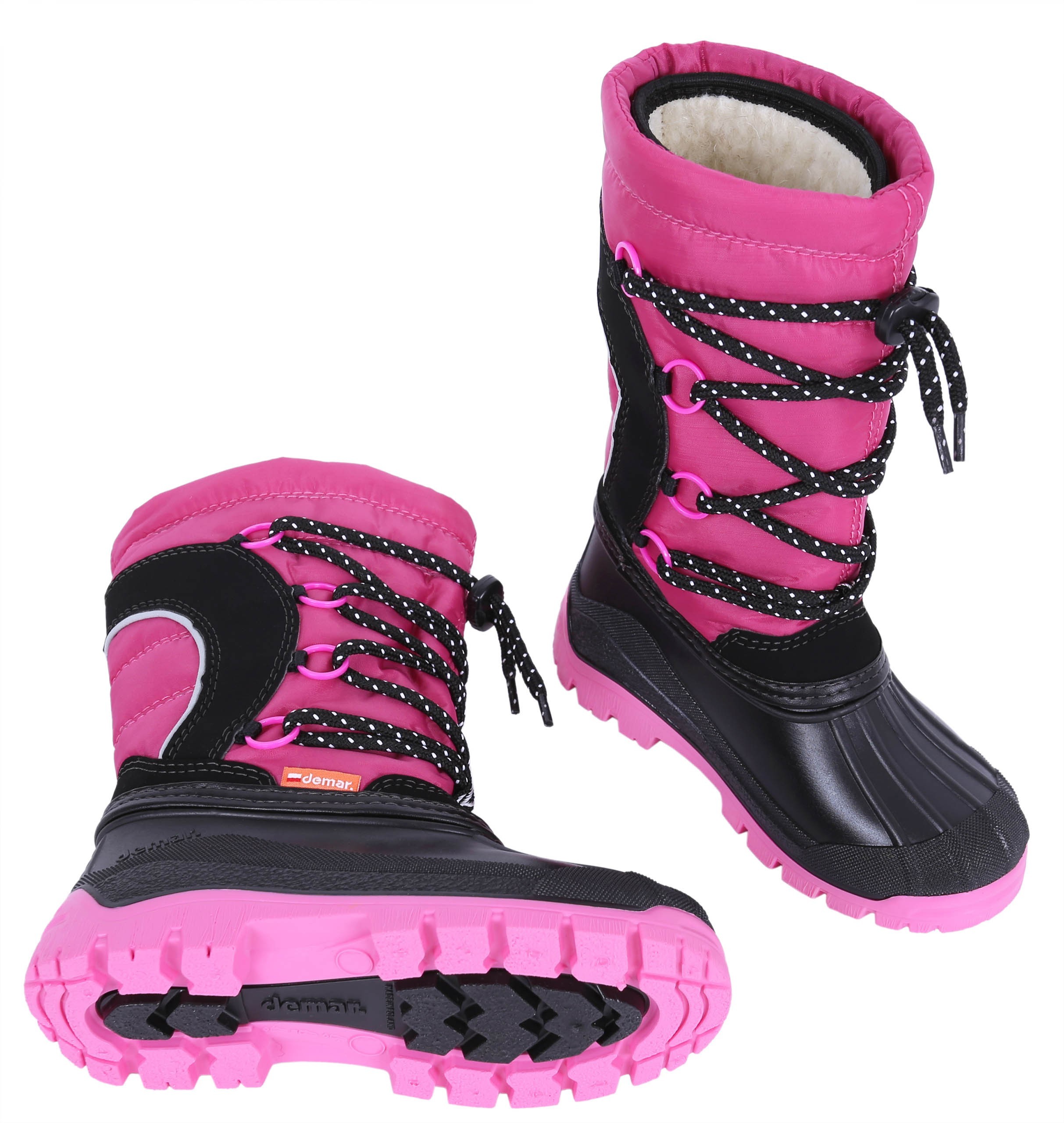 Śniegowce dla dzieci, w kolorze różowym wyprodukowane w Polsce, wnętrze ocieplane ciepłą, naturalną wełną.