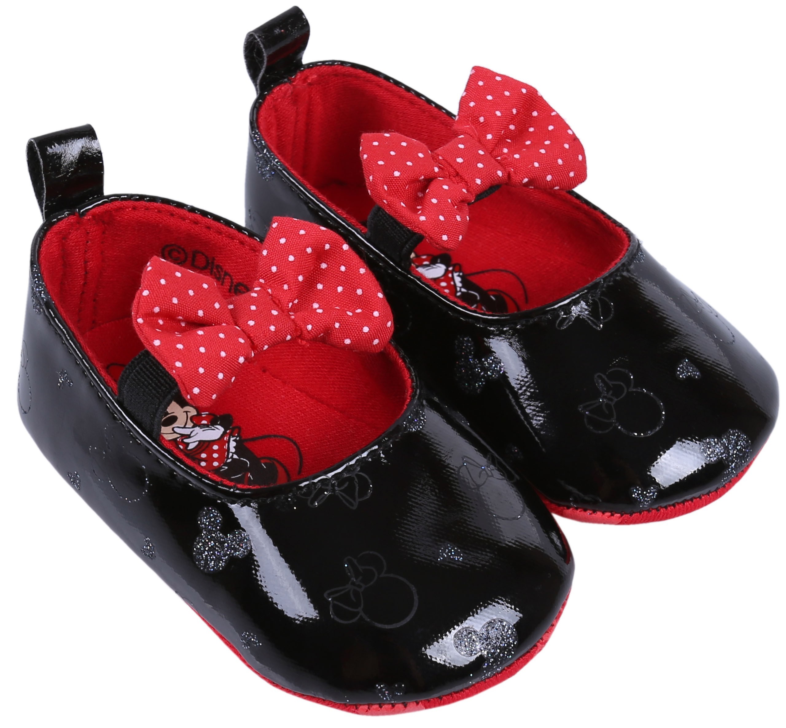 Czarno - czerwone, błyszczące balerinki niemowlęce z motywem Myszki Minnie.