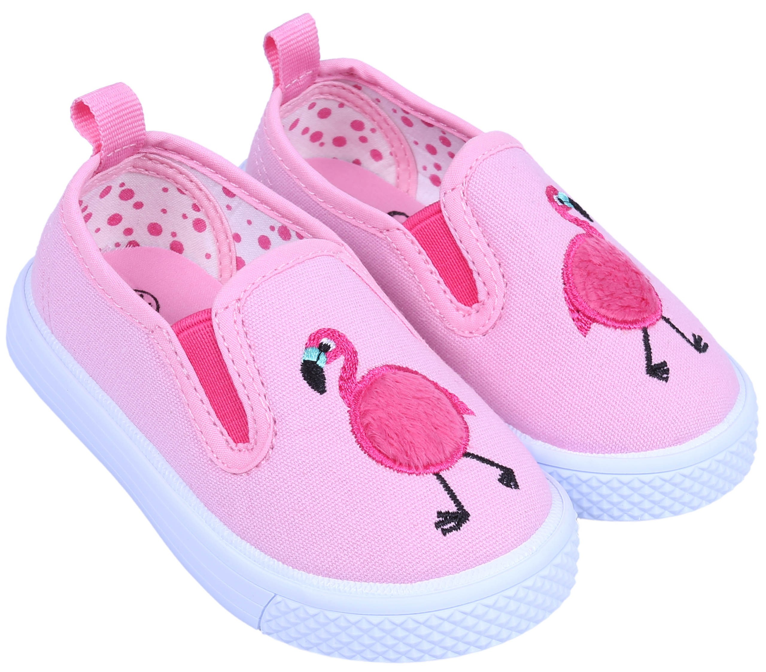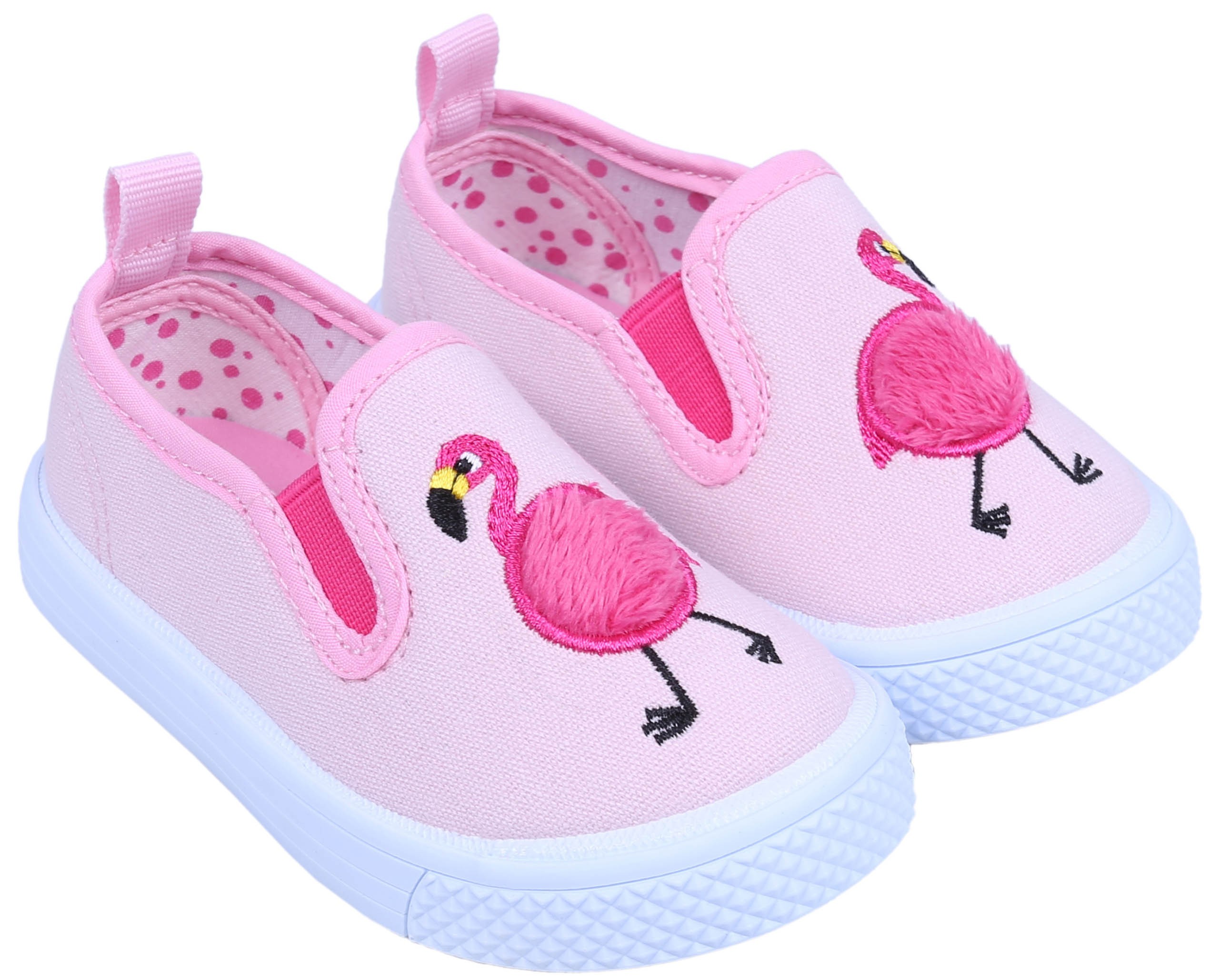 Jasnoróżowe, wsuwane trampki z gumeczkami ściągającymi oraz wizerunkiem flaminga.