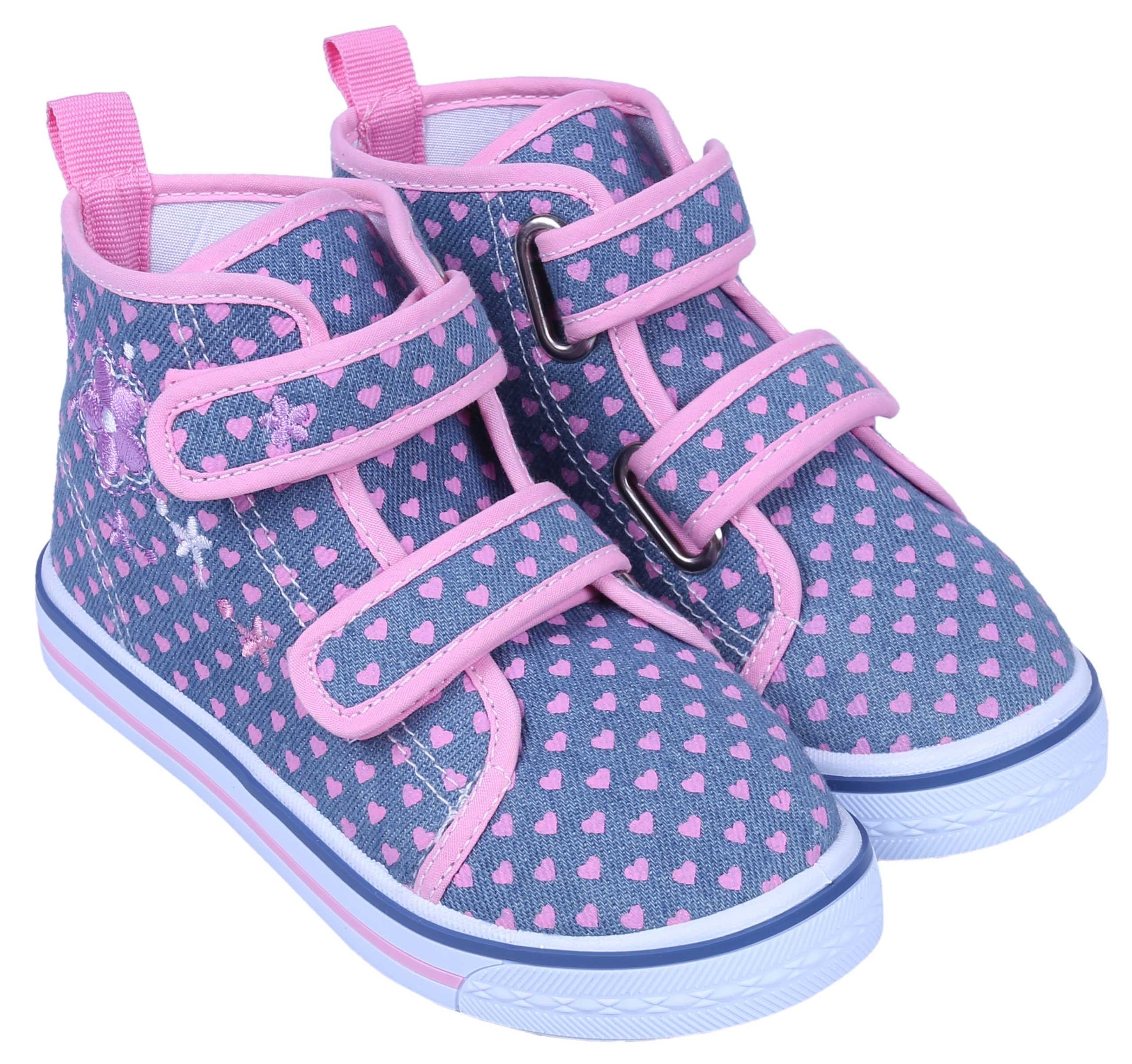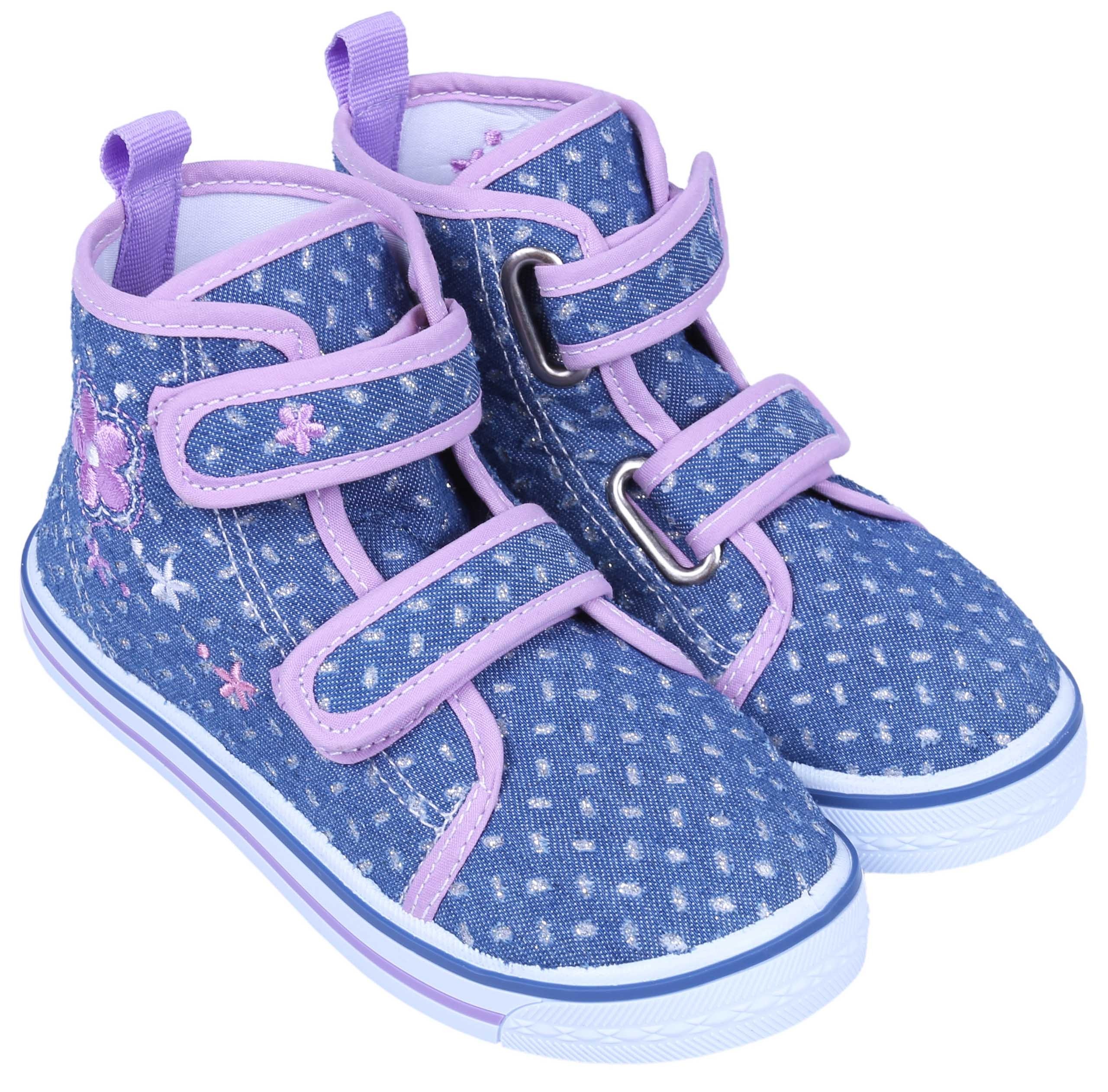 Jeansowe, dziewczęce trampki zapinane na dwa rzepy, co pozwala na dopasowanie obuwia do każdej dziecięcej stopy.