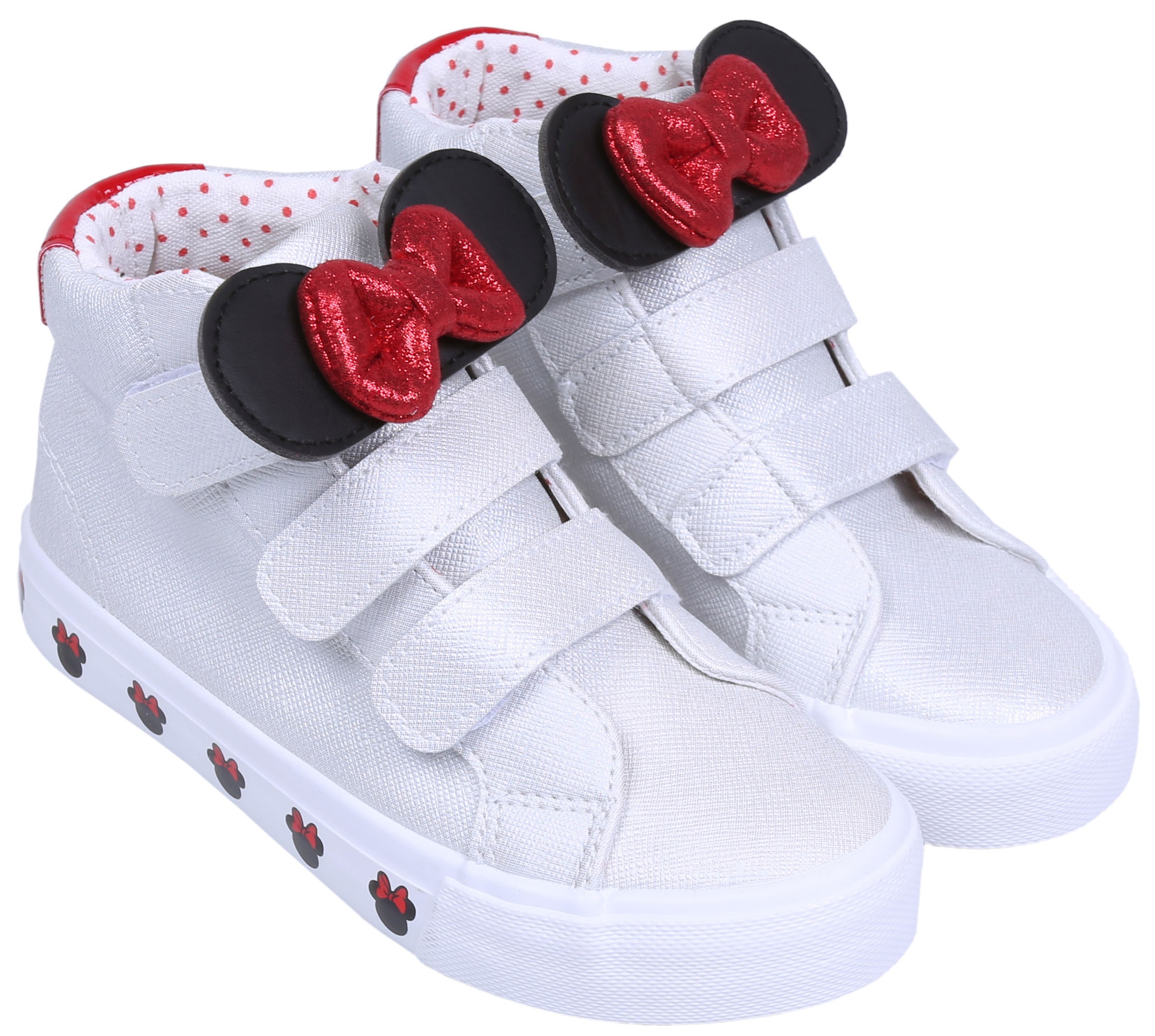 Białe, połyskujące trampki dziewczęce za kostkę, z motywem Myszki Minnie.
