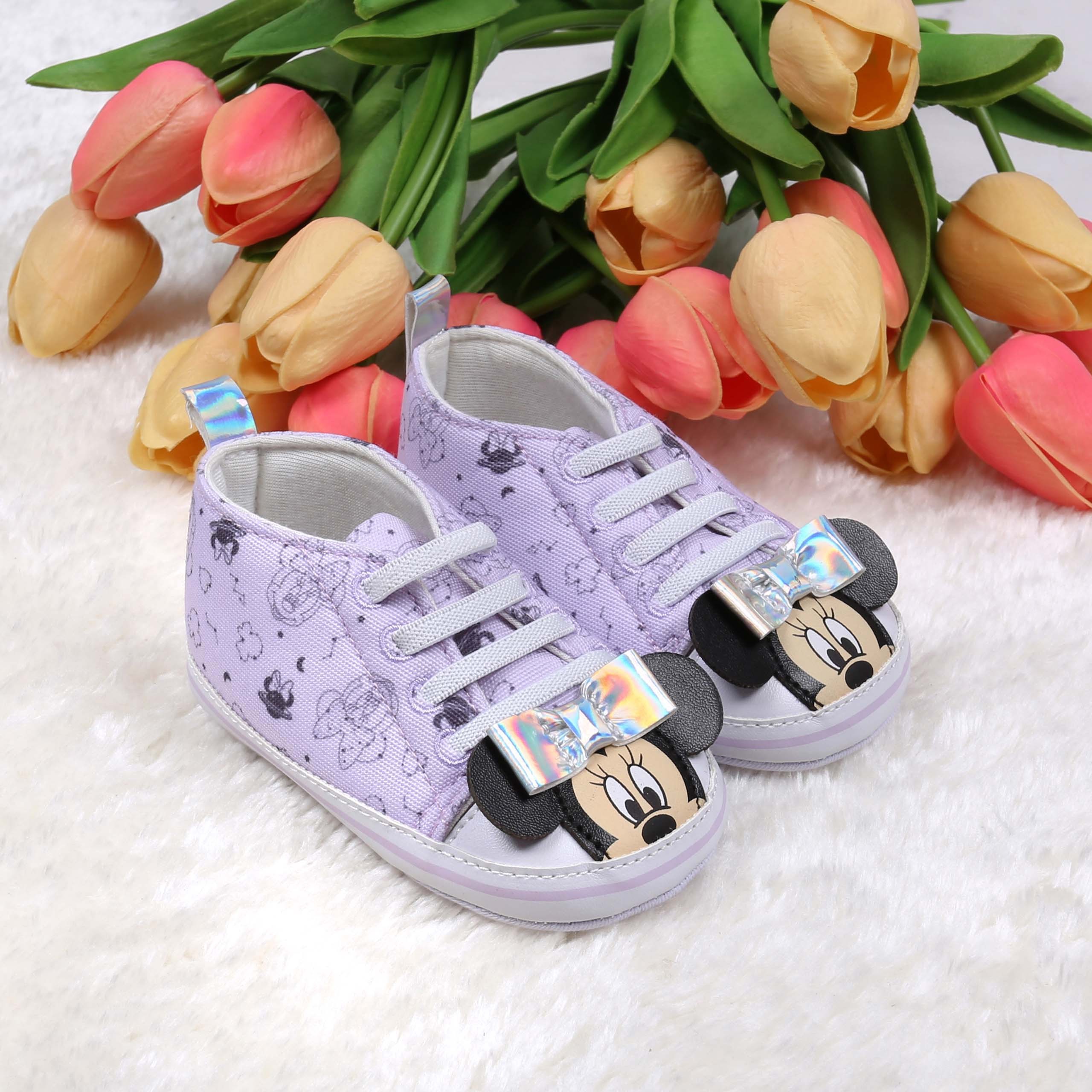 Fioletowe, niemowlęce, bardzo wygodne buciki niechodki w powtarzający się wizerunek uroczej Myszki Minnie.