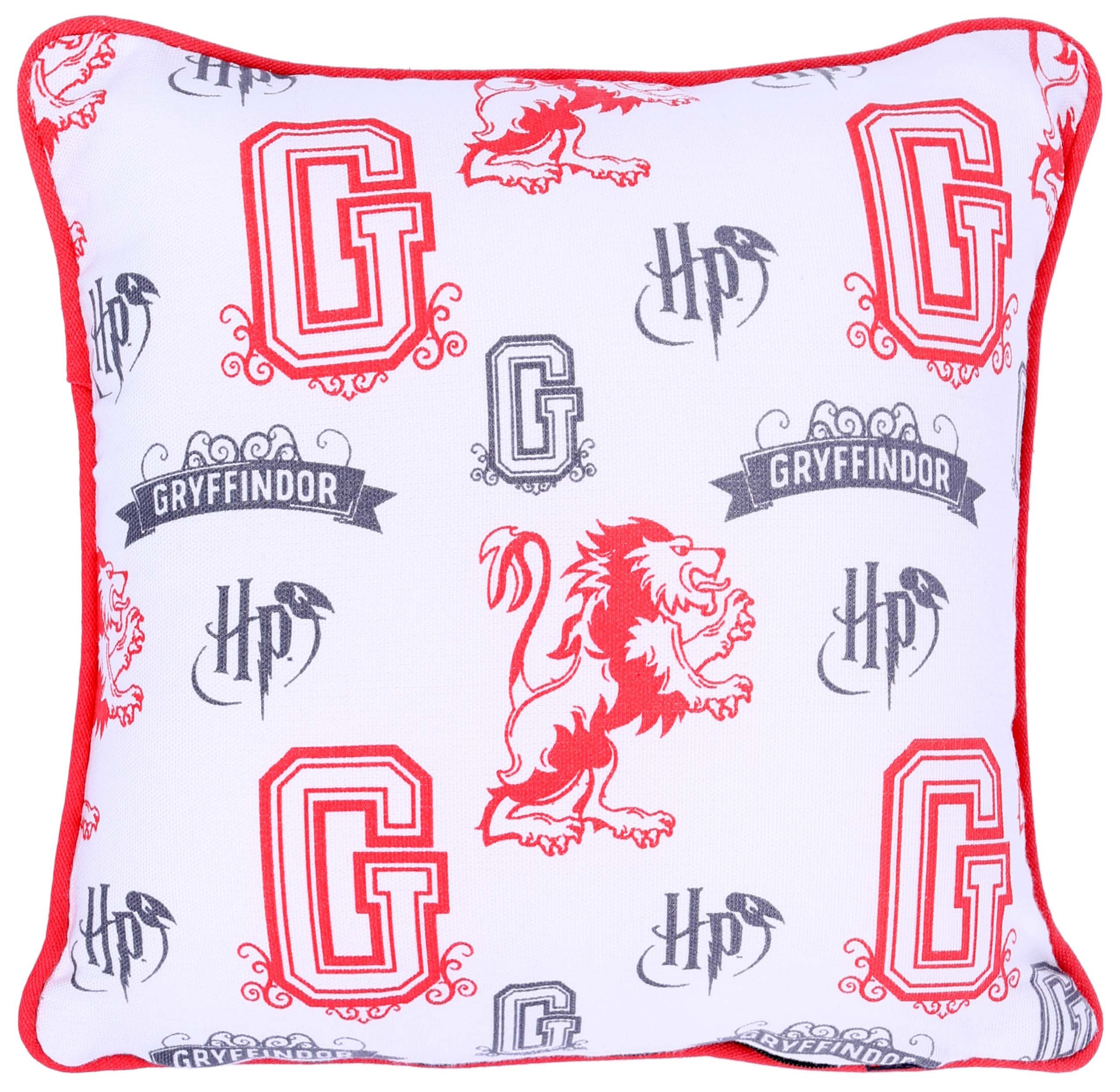 Szaro - czerwona poduszka z motywem jednego z domów Hogwartu - Gryffindor.