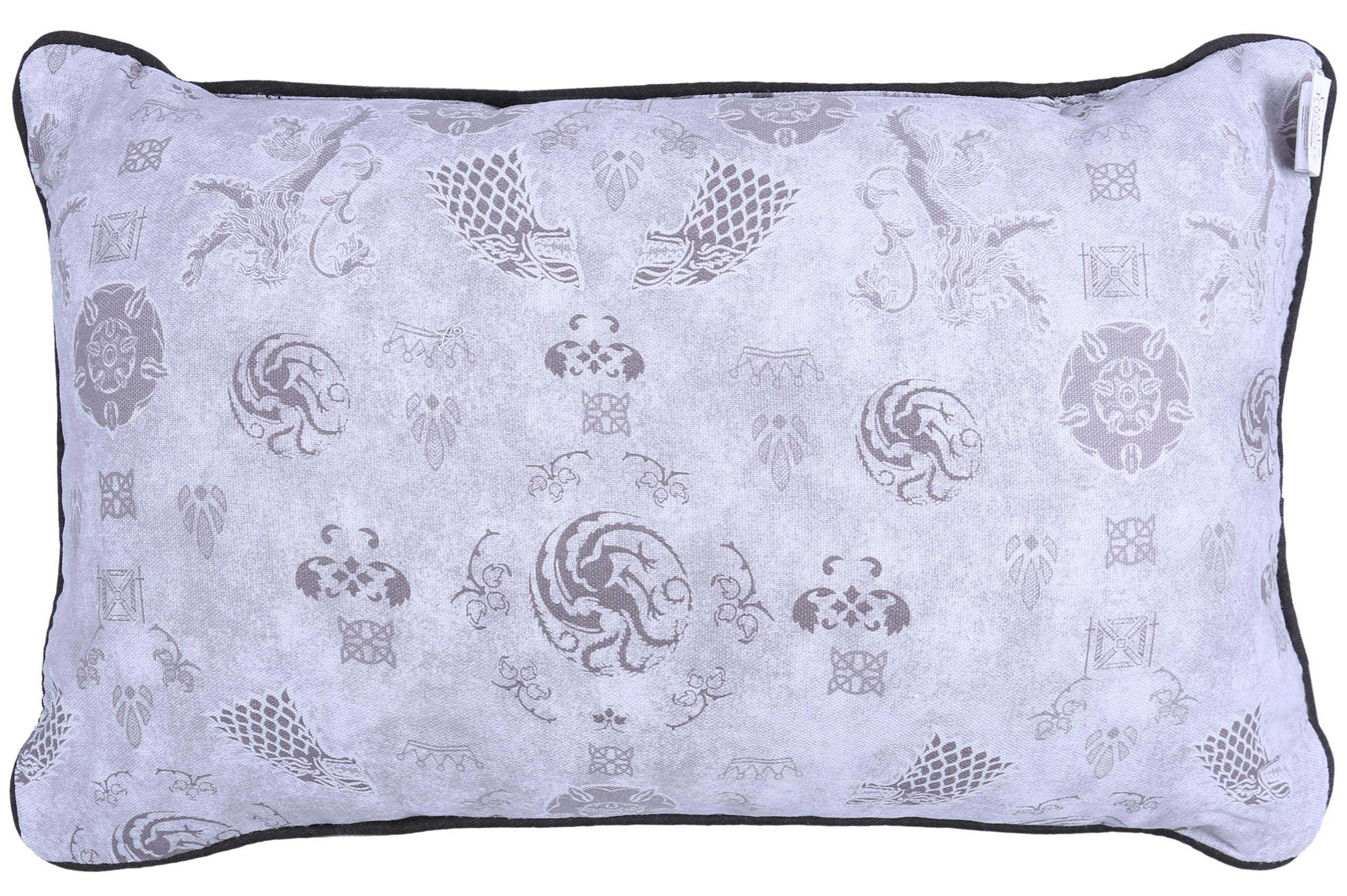 Szara, prostokątna poduszka z motywem mapy oraz symbolami rodów z serialu "Gra o Tron".