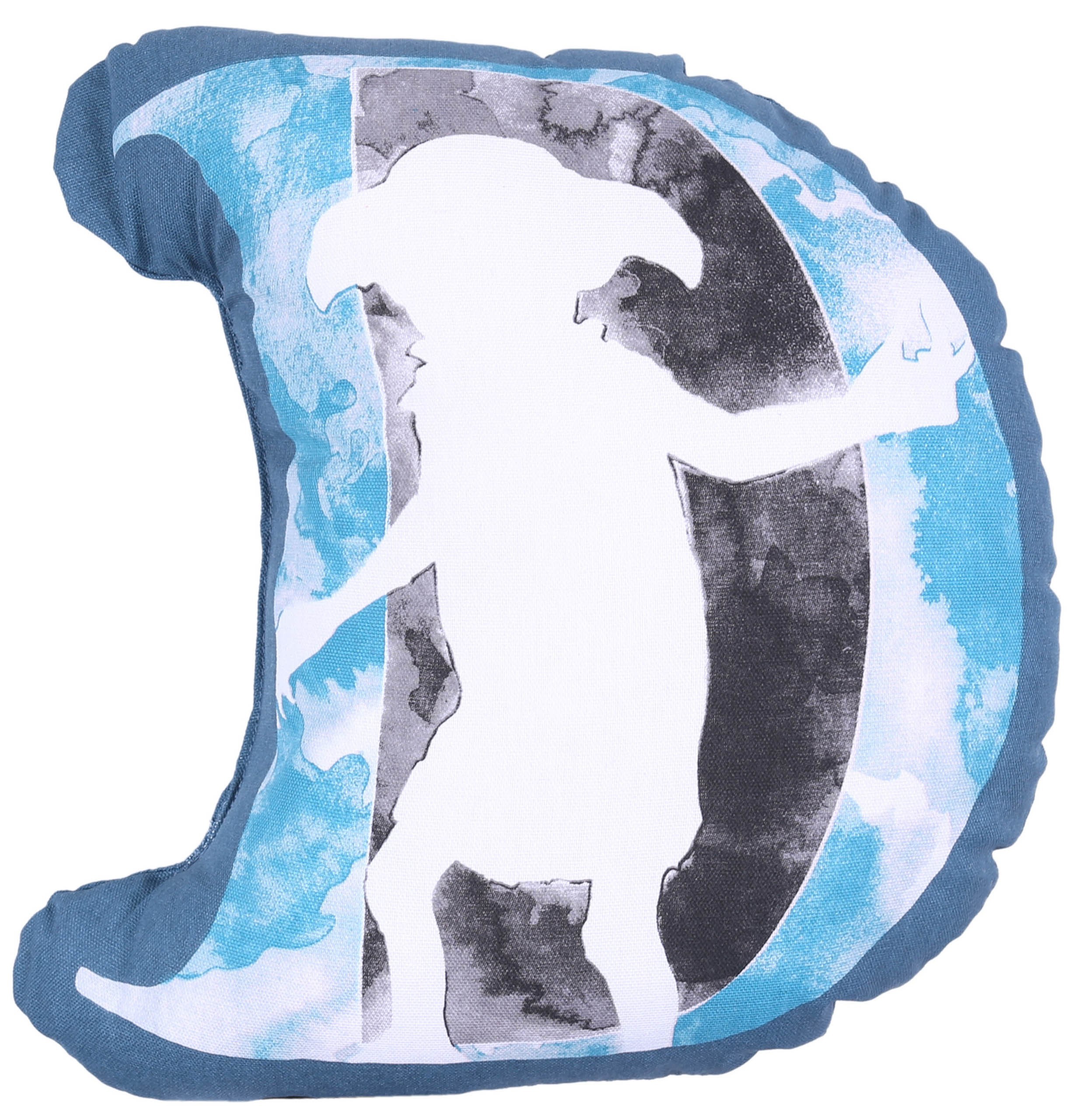 Duża poduszka w kształcie półksiężyca, w morskim kolorze.