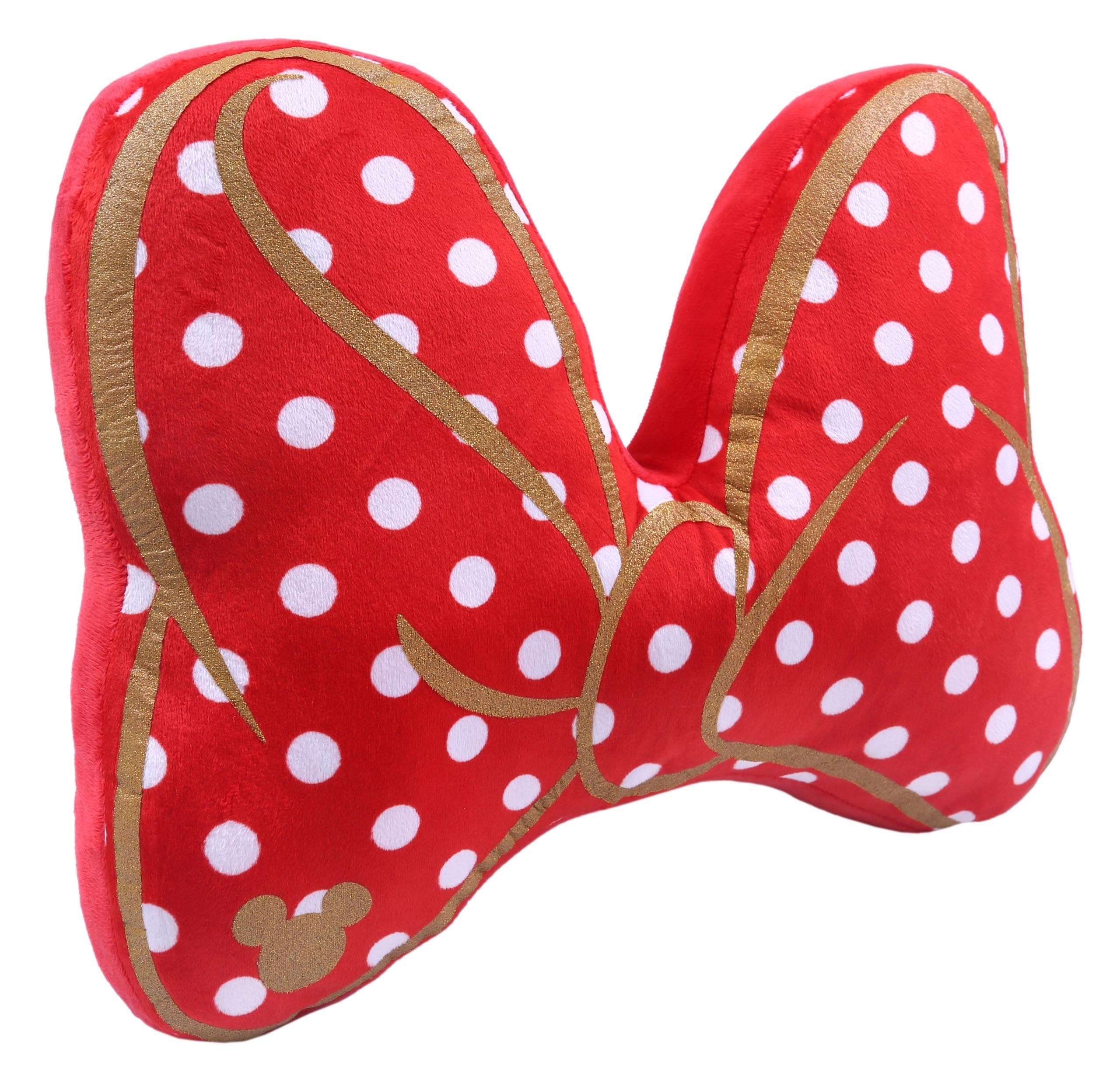 Czerwona poduszka w kropki, w kształcie kokardy Myszki Minnie.