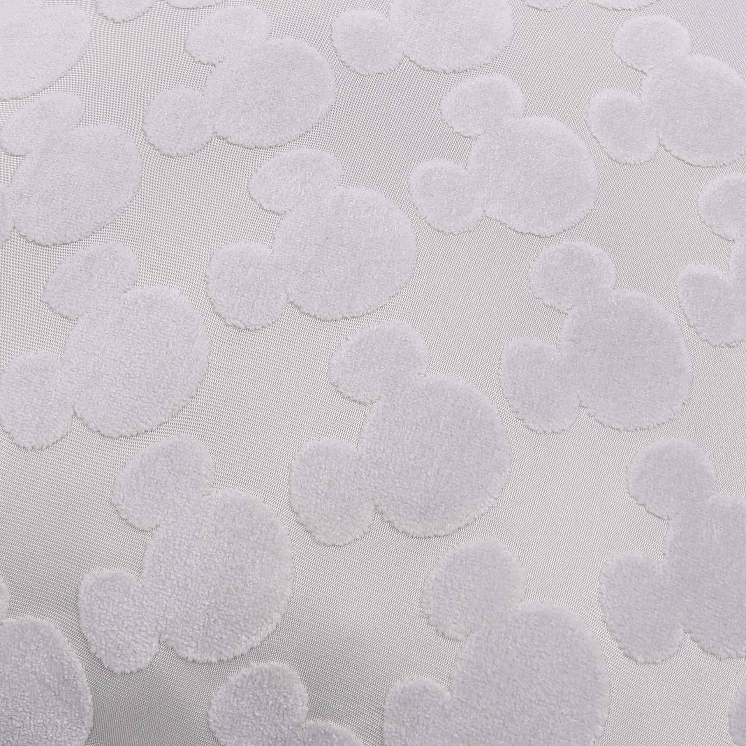 Duża, kwadratowa poduszka w szarym kolorze, w powtarzający się wytłaczany wzór Myszki Mickey.