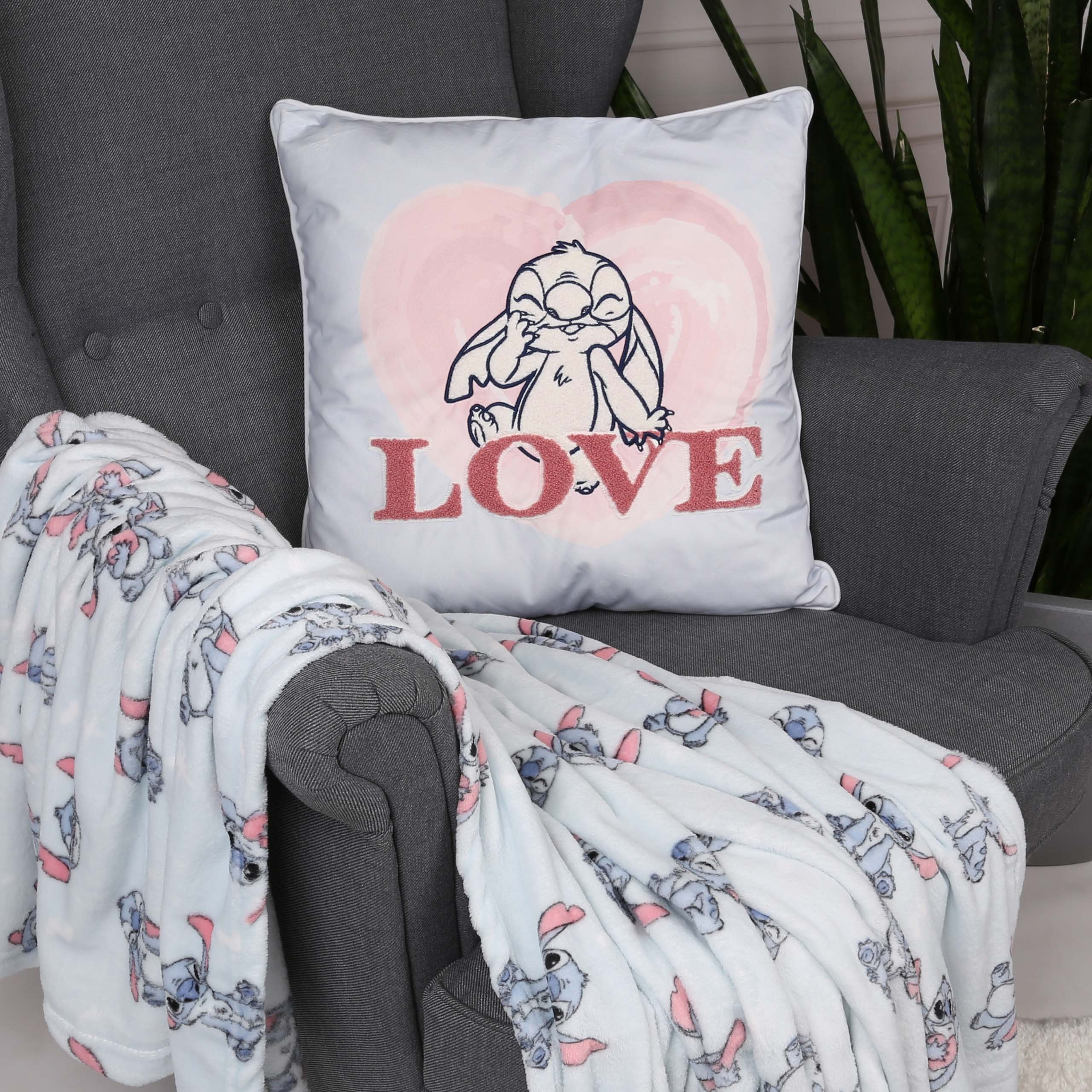 Kwadratowa poduszka w błękitnym kolorze, z haftem wizerunku uroczego Stitcha oraz napisem LOVE.