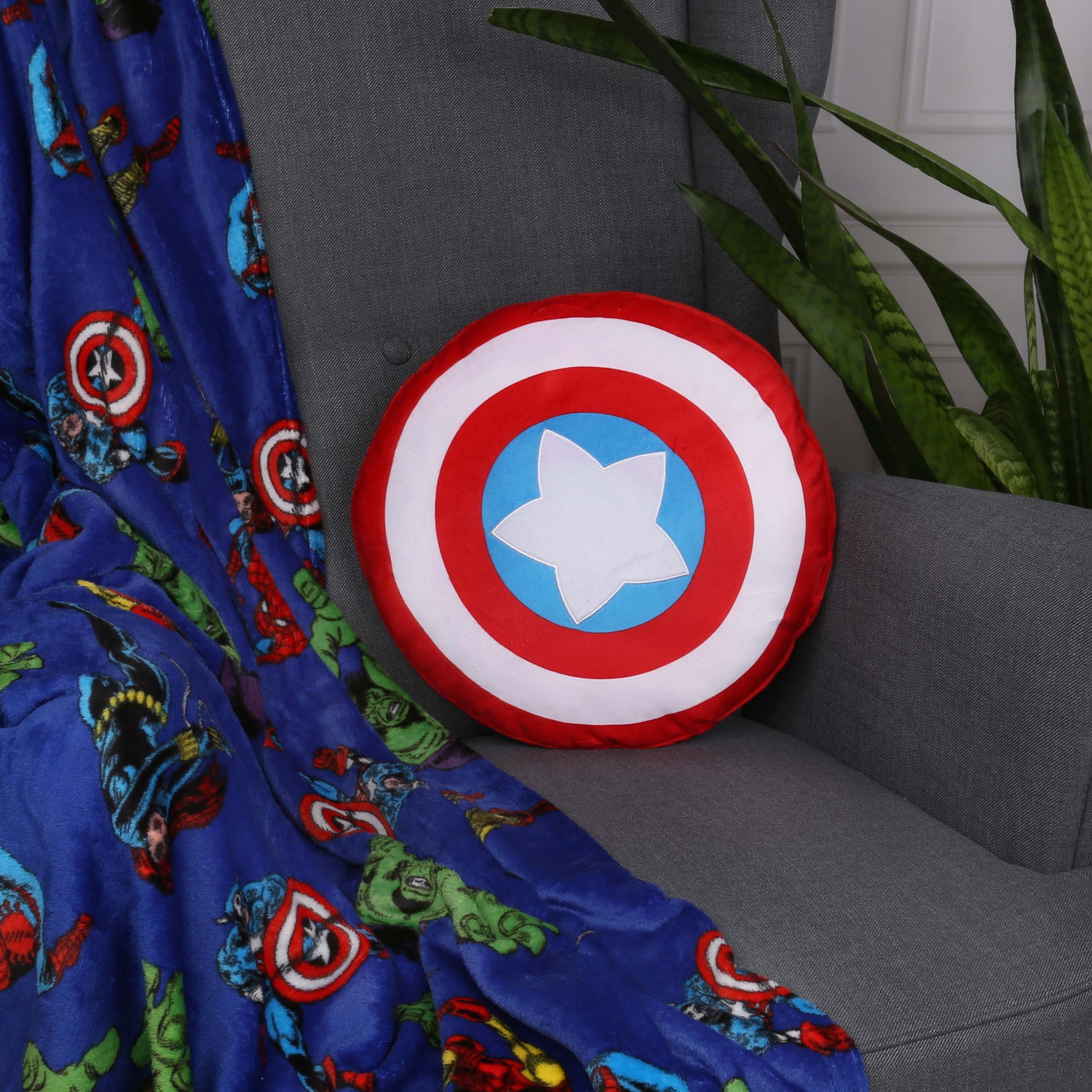 Czerwono-biała poduszka na wzór tarczy Kapitana Ameryki, poduszka jest lekka, puszysta i sprężysta.